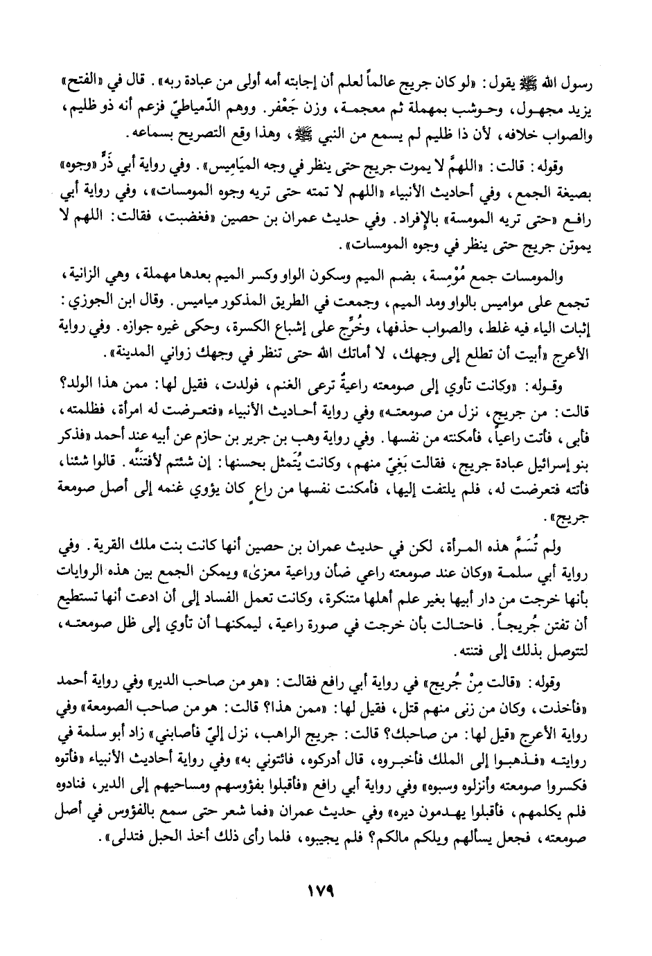 وقوله: قالت: "اللهمَّ لا يموت جريج حتى ينظر في وجه الميَامِيس". وفي رواية أبي ذَرٍّ "وجوه" بصيغة الجمع، وفي أحاديث الأنبياء "اللهم لا تمته حتى تريه وجوه المومسات"، وفي رواية أبي رافع "حتى تريه المومسة" بالإفراد. وفي حديث عمران بن حصين "فغضبت، فقالت: اللهم لا يموتن جريج حتى ينظر في وجوه المومسات".