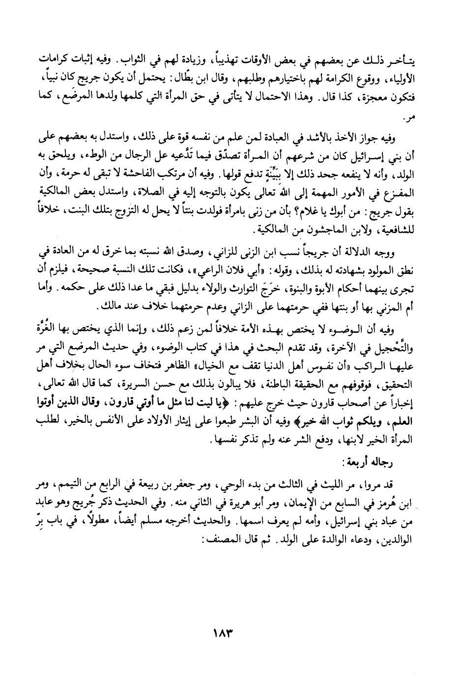 ووجه الدلالة أن جريجًا نسب ابن الزنى للزاني، وصدق الله نسبته بما خرق له من العادة في نطق المولود بشهادته له بذلك، وقوله: "أبي فلان الراعي"، فكانت تلك النسبة صحيحة، فيلزم أن تجرى بينهما أحكام الأبوة والبنوة، خرَجَ التوارث والولاء بدليل فبقي ما عدا ذلك على حكمه. وأما أم المزني بها أو بنتها ففي حرمتهما على الزاني وعدم حرمتهما خلاف عند مالك.
