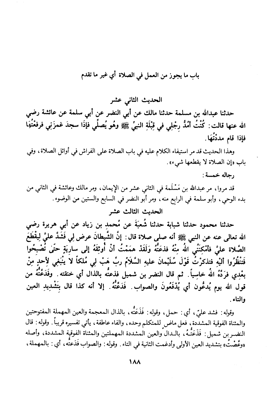 حَدَّثَنَا مَحْمُودٌ حَدَّثَنَا شَبَابَةُ حَدَّثَنَا شُعْبَةُ عَنْ مُحَمَّدِ بْنِ زِيَادٍ عَنْ أَبِي هُرَيْرَةَ رضي الله عنه عَنِ النَّبِيِّ -صلى الله عليه وسلم- أَنَّهُ صَلَّى صَلاَةً قَالَ: إِنَّ الشَّيْطَانَ عَرَضَ لِي، فَشَدَّ عَلَيَّ لِيَقْطَعَ الصَّلاَةَ عَلَيَّ، فَأَمْكَنَنِي اللَّهُ مِنْهُ، فَذَعَتُّهُ، وَلَقَدْ هَمَمْتُ أَنْ أُوثِقَهُ إِلَى سَارِيَةٍ حَتَّى تُصْبِحُوا فَتَنْظُرُوا إِلَيْهِ فَذَكَرْتُ قَوْلَ سُلَيْمَانَ عَلَيْهِ السَّلاَمُ رَبِّ هَبْ لِي مُلْكًا لاَ يَنْبَغِي لأَحَدٍ مِنْ بَعْدِي. فَرَدَّهُ اللَّهُ خَاسِيًا. ثُمَّ قَالَ النَّضْرُ بْنُ شُمَيْلٍ فَذَعَتُّهُ بِالذَّالِ أَيْ خَنَقْتُهُ وَفَدَعَّتُّهُ مِنْ قَوْلِ اللَّهِ {يَوْمَ يُدَعُّونَ} أَىْ يُدْفَعُونَ وَالصَّوَابُ، فَدَعَتُّهُ. إِلاَّ أَنَّهُ كَذَا قَالَ بِتَشْدِيدِ الْعَيْنِ وَالتَّاءِ.