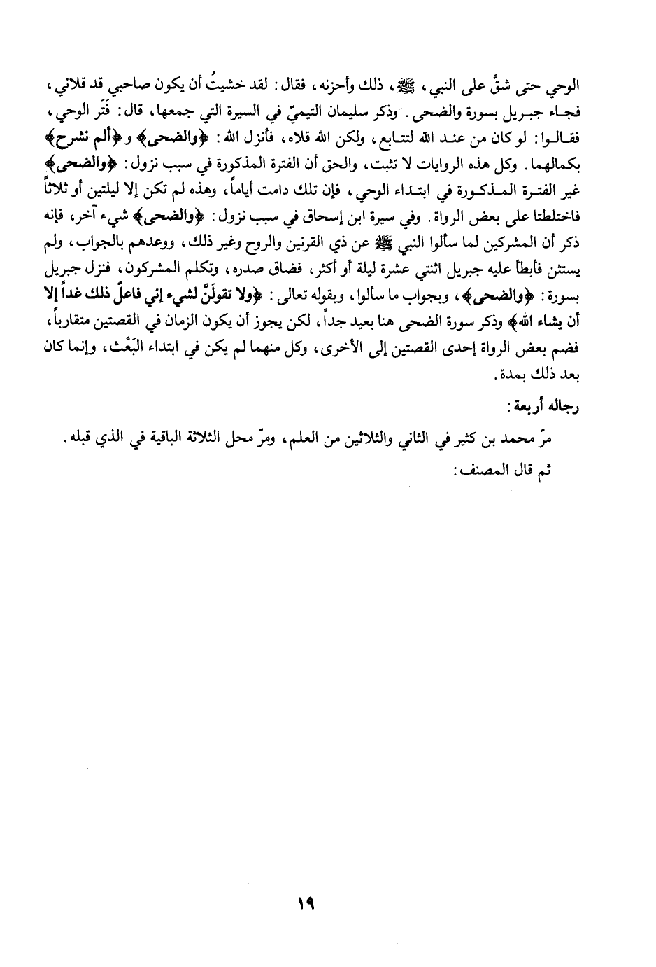 الوحي حتى شقَّ على النبي، -صلى الله عليه وسلم-، ذلك وأحزنه، فقال: لقد خشيتُ أن يكون صاحبي قد قلاني، فجاء جبريل بسورة والضحى. وذكر سليمان التيمي في السيرة التي جمعها، قال: فَتَر الوحي، فقالوا: لو كان من عند الله لتتابع، ولكن الله قلاه، فأنزل الله: {وَالضُّحَى} و {أَلَمْ نَشْرَحْ} بكمالهما. وكل هذه الروايات لا تثبت، والحق أن الفترة المذكورة في سبب نزول: {وَالضُّحَى} غير الفترة المذكورة في ابتداء الوحي، فإن تلك دامت أيامًا، وهذه لم تكن إلا ليلتين أو ثلاثًا فاختلطتا على بعض الرواة. وفي سيرة ابن إسحاق في سبب نزول: {وَالضُّحَى} شيء آخر، فإنه ذكر أن المشركين لما سألوا النبي -صلى الله عليه وسلم- عن ذي القرنين والروح وغير ذلك، ووعدهم بالجواب، ولم يستثن فأبطأ عليه جبريل اثنتي عشرة ليلة أو أكثر، فضاق صدره، وتكلم المشركون، فنزل جبريل بسورة: {وَالضُّحَى}، وبجواب ما سألوا، وبقوله تعالى: {وَلَا تَقُولَنَّ لِشَيْءٍ إِنِّي فَاعِلٌ ذَلِكَ غَدًا (23) إِلَّا أَنْ يَشَاءَ اللَّهُ} وذكر سورة الضحى هنا بعيد جدًا، لكن يجوز أن يكون الزمان في القصتين متقاربًا، فضم بعض الرواة إحدى القصتين إلى الأخرى، وكل منهما لم يكن في ابتداء البَعْث، وإنما كان بعد ذلك بمدة.