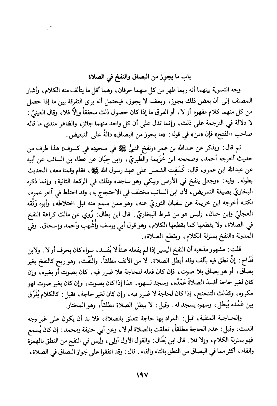 والحاجة المنفية، قيل: المراد بها حاجة تتعلق بالصلاة، فلابد أن يكون على غير وجه العبث، وقيل: عدم الحاجة مطلقًا، تعلقت بالصلاة أم لا، وعن أبي حنيفة ومحمد: إن كان يُسمع فهو بمنزلة الكلام، وإلا فلا. قال ابن بَطّال: والقول الأول أولى، وليس في النفخ من النطق بالهمزة والفاء، أكثر مما في البصاق من النطق بالتاء والفاء. قال: وقد اتفقوا على جواز البصاق في الصلاة،
