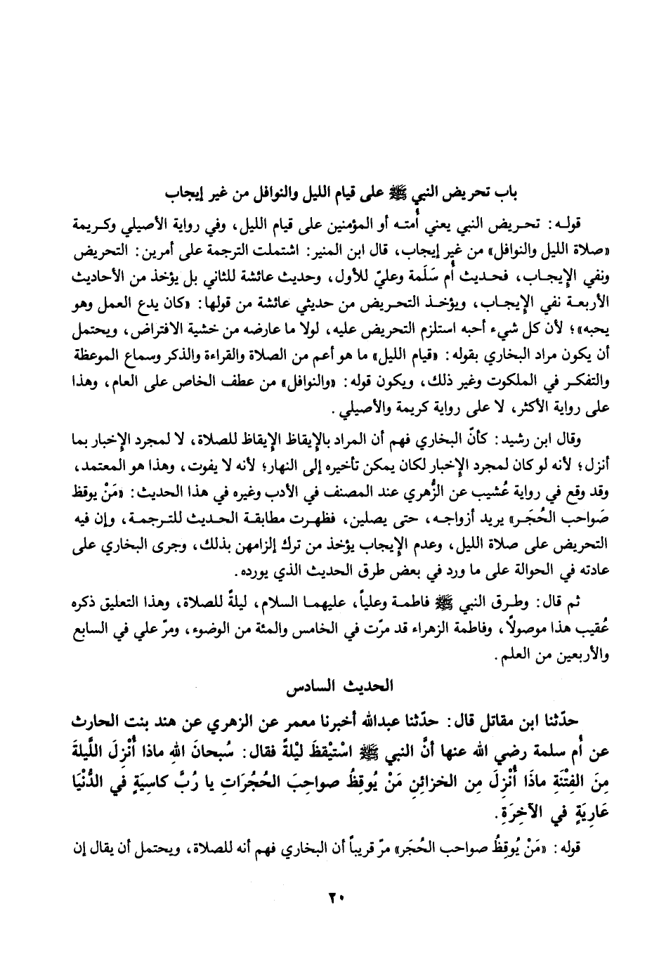 قوله: تحريض النبي يعني أُمته أو المؤمنين على قيام الليل، وفي رواية الأصيلي وكريمة "صلاة الليل والنوافل" من غير إيجاب، قال ابن المنير: اشتملت الترجمة على أمرين: التحريض ونفي الإيجاب، فحديث أُم سَلَمة وعليّ للأول، وحديث عائشة للثاني بل يؤخذ من الأحاديث الأربعة نفي الإيجاب، ويؤخذ التحريض من حديثي عائشة من قولها: "كان يدع العمل وهو يحبه"؛ لأن كل شيء أحبه استلزم التحريض عليه، لولا ما عارضه من خشية الافتراض، ويحتمل أن يكون مراد البخاري بقوله: "قيام الليل" ما هو أعم من الصلاة والقراءة والذكر وسماع الموعظة والتفكر في الملكوت وغير ذلك، ويكون قوله: "والنوافل" من عطف الخاص على العام، وهذا على رواية الأكثر، لا على رواية كريمة والأصيلي.