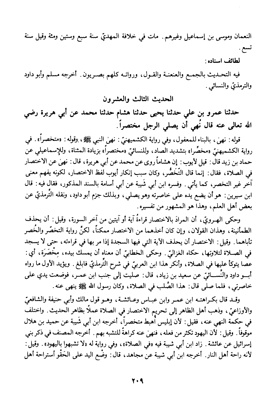 وحكى الهرويّ، أن المرادَ بالاختصار قراءةُ آية أو آيتين من آخر السورة، وقيل: أن يحذف الطمأنينة، وهذان القولان، وإن كان أخذهما من الاختصار ممكنًا، لكنَّ رواية التخصّر والخُصر تأباهما. وقيل: الاختصار أن يحذف الآية التي فيها السجدة إذا مرَّ بها في قراءته، حتى لا يسجد في الصلاة لتلاوتها، حكاه الغزاليّ. وحكى الخطابيّ أن معناه أن يمسك بيده، مِخْصَرَة، أي: عصا يتوكأ عليها في الصلاة، وأنكر هذا ابن العربي في شرح الترمذيّ فأبلغ. ويؤيد الأول ما رواه أبو داود والنَّسائيّ عن سعيد بن زياد، قال: صليت الى جنب ابن عمر، فوضعت يدي على خاصرتي، فلما صلى قال: هذا الصَّلب في الصلاة، وكان رسول الله -صلى الله عليه وسلم- ينهى عنه.