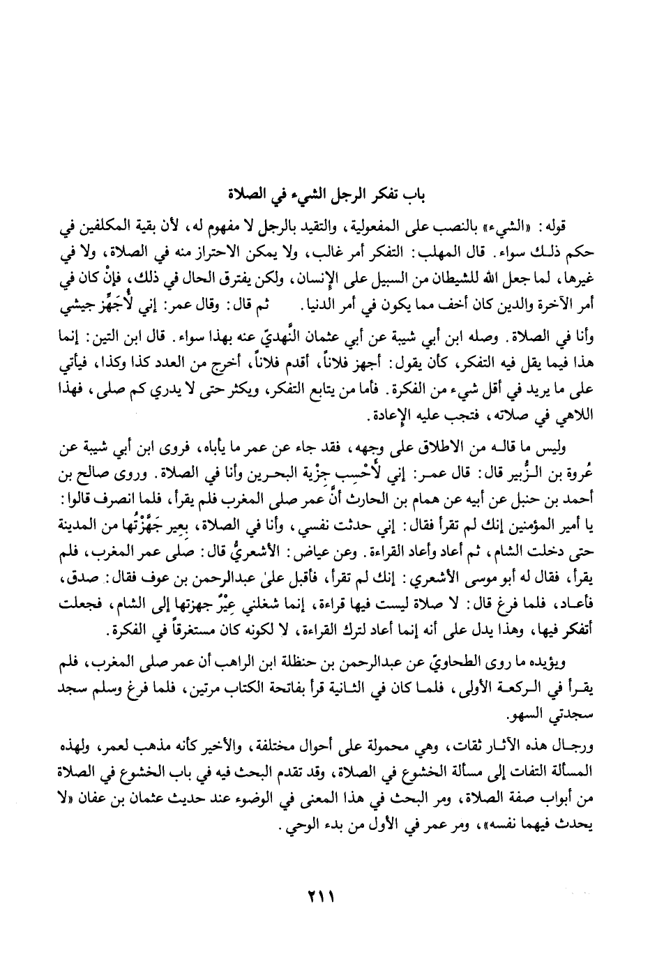 وليس ما قاله من الإطلاق على وجهه، فقد جاء عن عمر ما يأباه، فروى ابن أبي شيبة عن عُروة بن الزُّبير قال: قال عمر: إني لأَحْسِب جزْية البحرين وأنا في الصلاة. وروى صالح بن أحمد بن حنبل عن أبيه عن همام بن الحارث أنَّ عمر صلى المغرب فلم يقرأ، فلما انصرف قالوا: يا أمير المؤمنين إنك لم تقرأ فقال: إني حدثت نفسي، وأنا في الصلاة، بعِير جَهَّزْتُها من المدينة حتى دخلت الشام، ثم أعاد وأعاد القراءة. وعن عياض: الأشعريُّ قال: صلى عمر المغرب، فلم يقرأ، فقال له أبو موسى الأشعري: إنك لم تقرأ، فأقبل على عبد الرحمن بن عوف فقال: صدق، فأعاد، فلما فرغ قال: لا صلاة ليست فيها قراءة، إنما شغلني عِيْرٌ جهزتها إلى الشام، فجعلت أتفكر فيها، وهذا يدل على أنه إنما أعاد لترك القراءة، لا لكونه كان مستغرقًا في الفكرة.