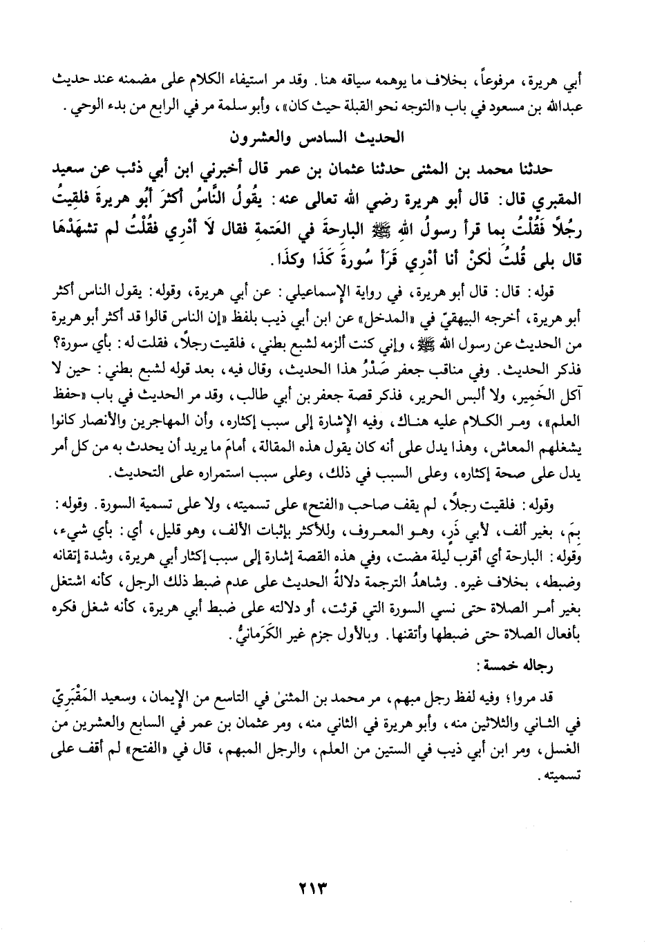 قد مرّوا؛ وفيه لفظ رجل مبهم، مرَّ محمد بن المثنى في التاسع من الإيمان، وسعيد المَقْبَرِيّ في الثاني والثلاثين منه، وأبو هريرة في الثاني منه، ومرَّ عثمان بن عمر في السابع والعشرين من الغسل، ومرَّ ابن أبي ذيب في الستين من العلم، والرجل المبهم، قال في "الفتح" لم أقف على تسميته.