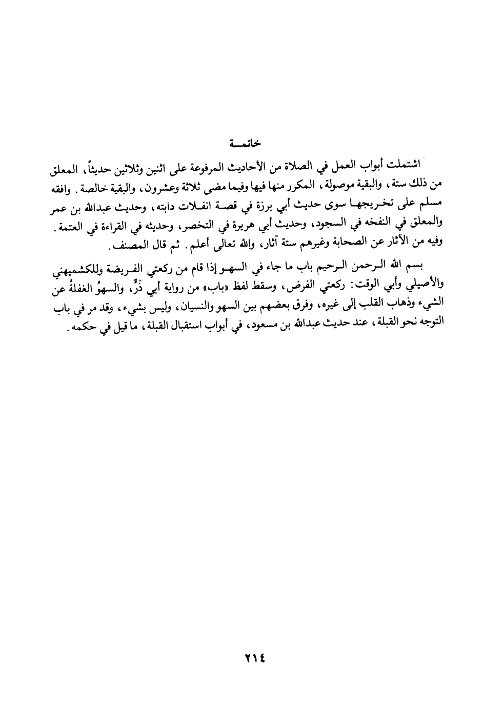 اشتملت أبواب العمل في الصلاة من الأحاديث المرفوعة على اثنين وثلاثين حديثًا، المعلق من ذلك ستة، والبقية موصولة، المكرر منها فيها وفيما مضى ثلاثة وعشرون، والبقية خالصة. وافقه مسلم على تخريجها سوى حديث أبي برزة في قصة انفلات دابته، وحديث عبد الله بن عمر والمعلق في النفخه في السجود، وحديث أبي هريرة في التخصر، وحديثه في القراءة في العتمة. وفيه من الآثار عن الصحابة وغيرهم ستة آثار، والله تعالى أعلم. ثم قال المصنف:
