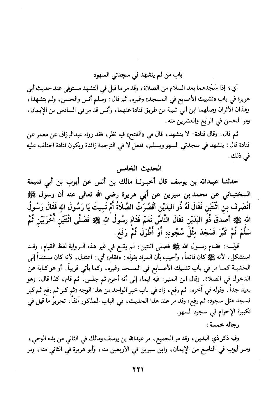 وفيه ذكر ذي اليدين، وقد مرَّ الجميع، مرَّ عبد الله بن يوسف ومالك في الثاني من بدء الوحي، ومرَّ أيوب في التاسع من الإيمان، وابن سيرين في الأربعين منه، وأبو هريرة في الثاني منه، ومرَّ