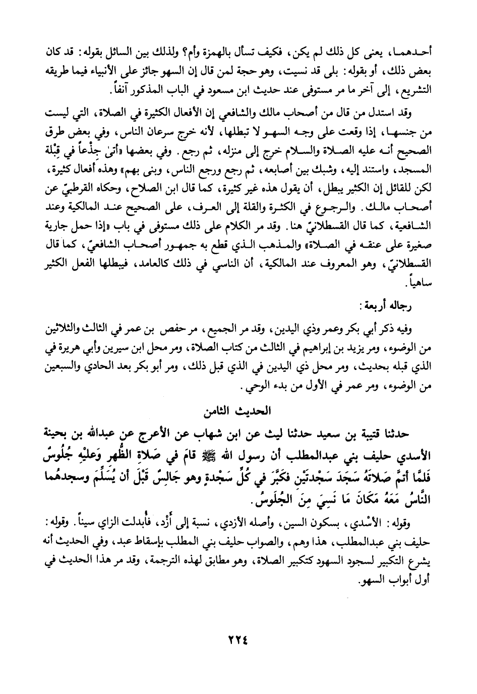 وقوله: الأسْدي، بسكون السين، وأصله الأزدي، نسبة إلى أَزْد، فأُبدلت الزاي سينًا. وقوله: حليف بني عبد المطلب، هذا وهم، والصواب حليف بني المطلب بإسقاط عبد، وفي الحديث أنه يشرع التكبير لسجود السهود كتكبير الصلاة، وهو مطابق لهذه الترجمة، وقد مرَّ هذا الحديث في أول أبواب السهو.