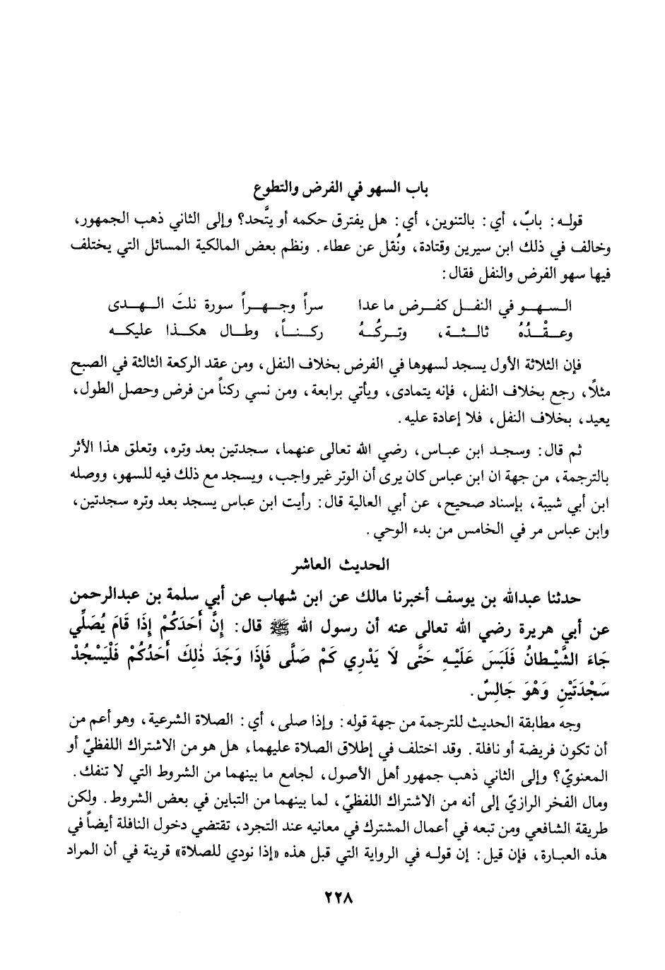 قوله: بابٌ، أي: بالتنوين، أي: هل يفترق حكمه أو يتَّحد؟ وإلى الثاني ذهب الجمهور، وخالف في ذلك ابن سيرين وقتادة، ونُقل عن عطاء. ونظم بعض المالكية المسائل التي يختلف فيها سهو الفرض والنفل فقال: