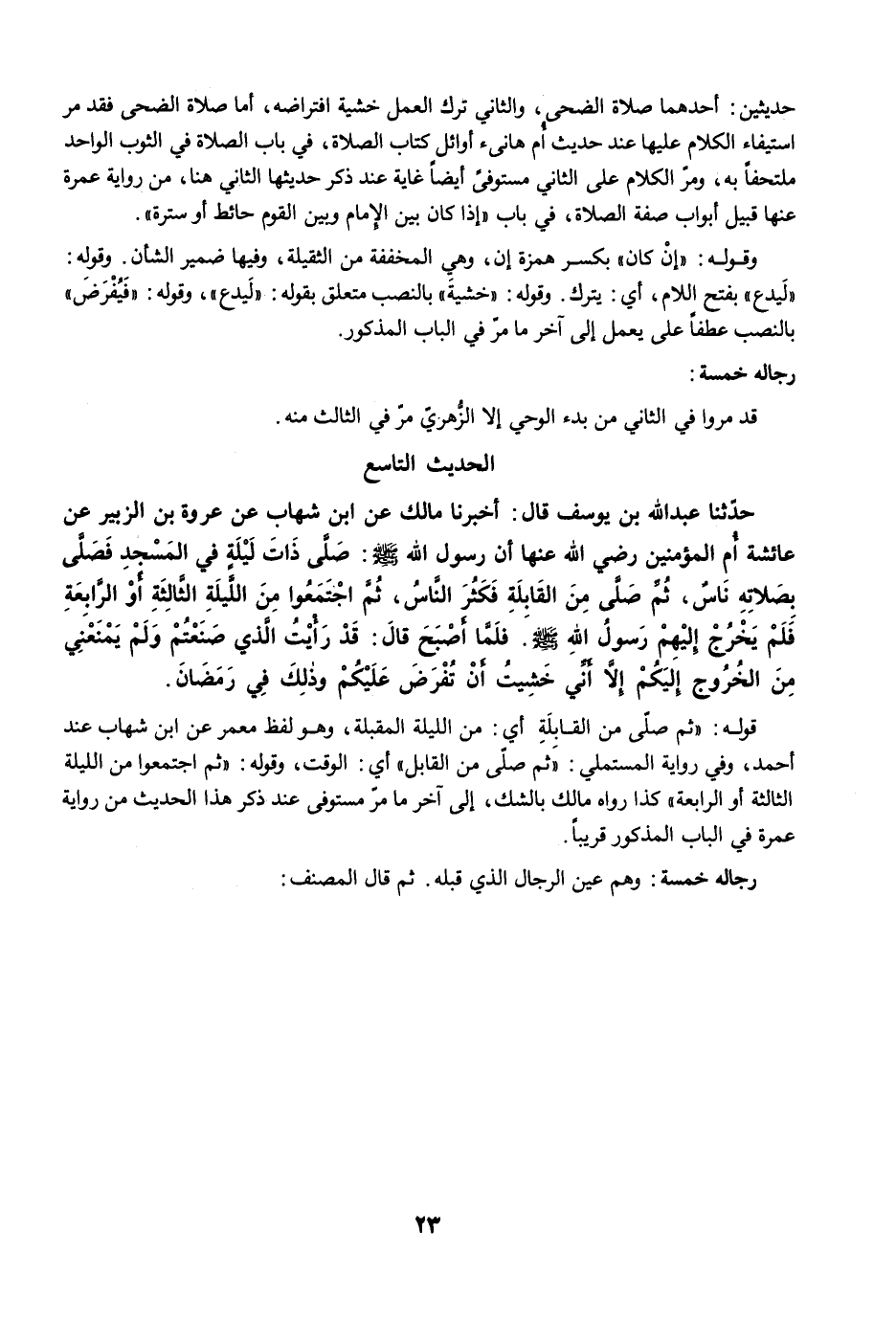 حديثين: أحدهما صلاة الضحى، والثاني ترك العمل خشية افتراضه، أما صلاة الضحى فقد مرَّ استيفاء الكلام عليها عند حديث أُم هانىء أوائل كتاب الصلاة، في باب الصلاة في الثوب الواحد ملتحفًا به، ومرّ الكلام على الثاني مستوفى أيضًا غاية عند ذكر حديثها الثاني هنا، من رواية عمرة عنها قبيل أبواب صفة الصلاة، في باب "إذا كان بين الإِمام وبين القوم حائط أو سترة".