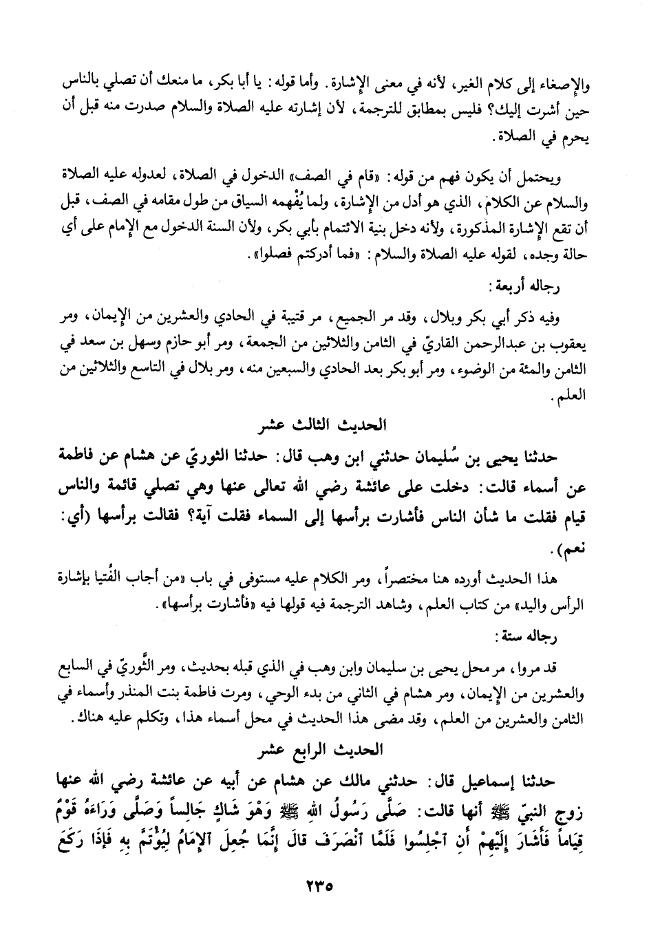 والإِصغاء إلى كلام الغير؛ لأنه في معنى الإِشارة. وأما قوله: يا أبا بكر، ما منعك أن تصلي بالناس حين أشرت إليك؟ فليس بمطابق للترجمة، لأنّ إشارته عليه الصلاة والسلام صدرت منه قبل أن يحرم في الصلاة.