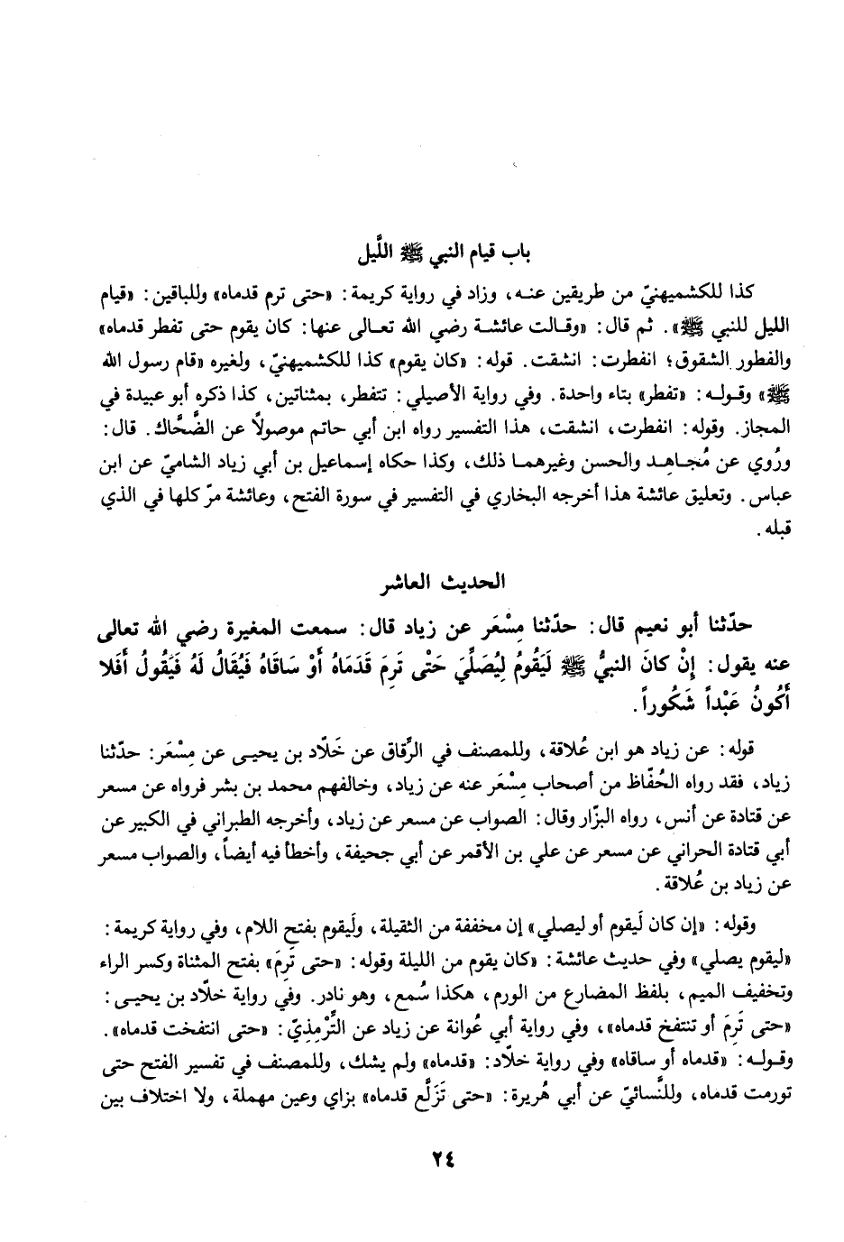 حَدَّثَنَا أَبُو نُعَيْمٍ قَالَ: حَدَّثَنَا مِسْعَرٌ عَنْ زِيَادٍ قَالَ: سَمِعْتُ الْمُغِيرَةَ رضي الله عنه يَقُولُ: إِنْ كَانَ النَّبِيُّ -صلى الله عليه وسلم- لَيَقُومُ لِيُصَلِّيَ حَتَّى تَرِمُ قَدَمَاهُ أَوْ سَاقَاهُ، فَيُقَالُ لَهُ فَيَقُولُ أَفَلاَ أَكُونُ عَبْدًا شَكُورًا.