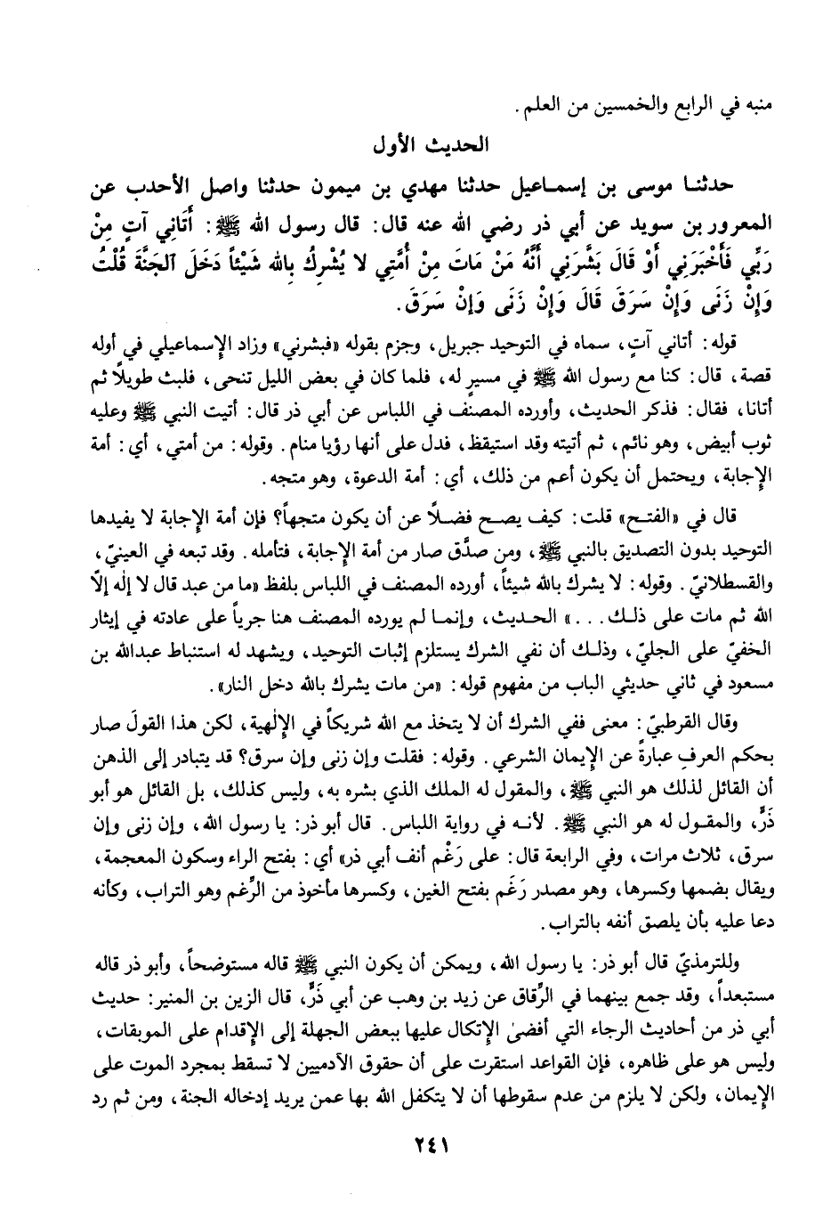 حَدَّثَنَا مُوسَى بْنُ إِسْمَاعِيلَ حَدَّثَنَا مَهْدِيُّ بْنُ مَيْمُونٍ حَدَّثَنَا وَاصِلٌ الأَحْدَبُ عَنِ الْمَعْرُورِ بْنِ سُوَيْدٍ عَنْ أَبِي ذَرٍّ رضي الله عنه قَالَ: قَالَ رَسُولُ اللَّهِ -صلى الله عليه وسلم-: أَتَانِي آتٍ مِنْ رَبِّي فَأَخْبَرَنِي أَوْ قَالَ بَشَّرَنِي أَنَّهُ مَنْ مَاتَ مِنْ أُمَّتِي لاَ يُشْرِكُ بِاللَّهِ شَيْئًا دَخَلَ الْجَنَّةَ. قُلْتُ وَإِنْ زَنَى وَإِنْ سَرَقَ قَالَ وَإِنْ زَنَى وَإِنْ سَرَقَ.