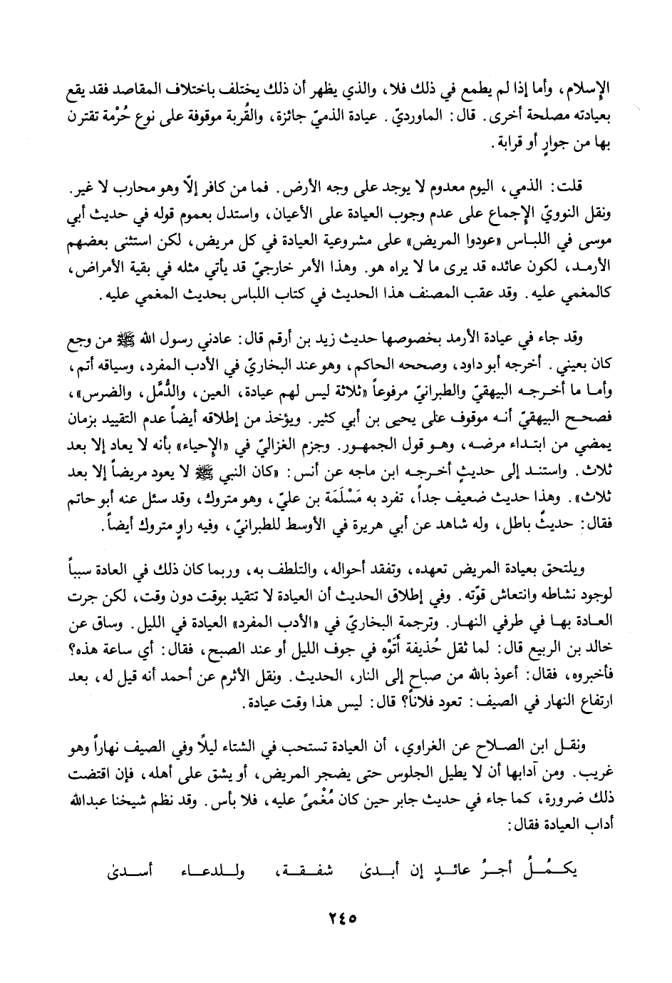 ونقل ابن الصلاح عن الغراوي، أن العيادة تستحب في الشتاء ليلًا وفي الصيف نهارًا وهو غريب. ومن آدابها أن لا يطيل الجلوس حتى يضجر المريض، أو يشق على أهله، فإن اقتضت ذلك ضرورة، كما جاء في حديث جابر حين كان مُغْمىً عليه، فلا بأس. وقد نظم شيخنا عبد الله أداب العيادة فقال: