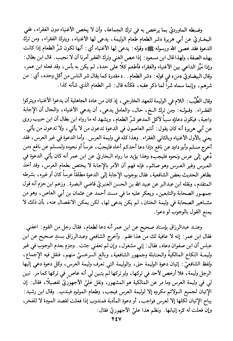وعند عبد الرزاق بإسناد صحيح عن ابن عمر أنه دعا لطعام، فقال رجل من القوم: اعفني. فقال ابن عمر: إنه لا عافية لك من هذا فقم. وأخرج الشافعي وعبد الرزاق بسندٍ صحيح عن ابن عباس أن ابن صفوان دعاه، فقال: إني مشغول، وإن لم تعفني جئت. وجزم بعدم الوجوب في غير وليمة النكاح المالكيةُ والحنابلة وجمهور الشافعية، وبالغ السرخسيّ منهم، فنقل فيه الإِجماع، ولفظ الشافعيّ: إتيان دعوة الوليمة حق، والوليمة التي تعرف وليمة العرس، وكل دعوة دعي إليها الرجل وليمة، فلا أرخص لأحد في تركها، ولو تركها لم يتبين لي أنه عاصٍ في تركها كما مرَّ. تبين لي في وليمة العرس وما مرَّ عن المالكية هو المشهور، ونقل عَلِيّ الأجهوريّ تفصيلًا، فقال: إن الإتيان لجميع الولائم مكروه إلا لوليمة العرس فيجب، وطعام المولود فيندب. وقال ابن رشيد: يباح الإِتيان لكلها إلا لعرس فواجب، أو دعوة المأدبة فمندوب إذا فعلت لقصد المودة لا للفخر، وإن فعلت له كره إتيانها. ونظم هذا على الأجهوريّ فقال: