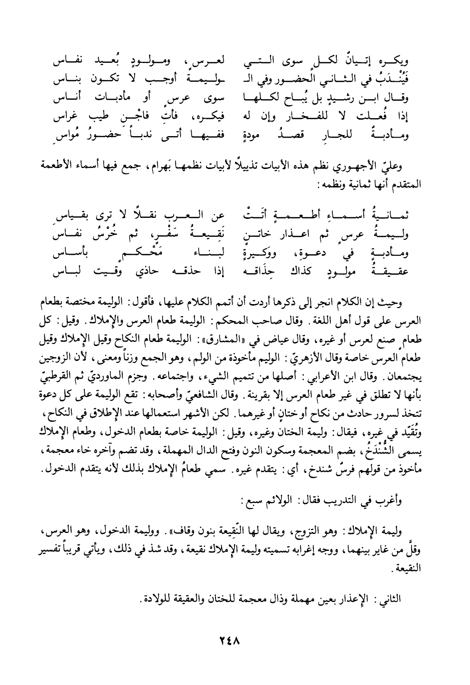 وليمة الإِملاك: وهو التزوج، ويقال لها النّقِيعة بنون وقاف". ووليمة الدخول، وهو العرس، وقلَّ من غاير بينهما، ووجه إغرابه تسميته وليمة الإِملاك نقيعة، وقد شذ في ذلك، ويأتي قريبًا تفسير النقيعة.