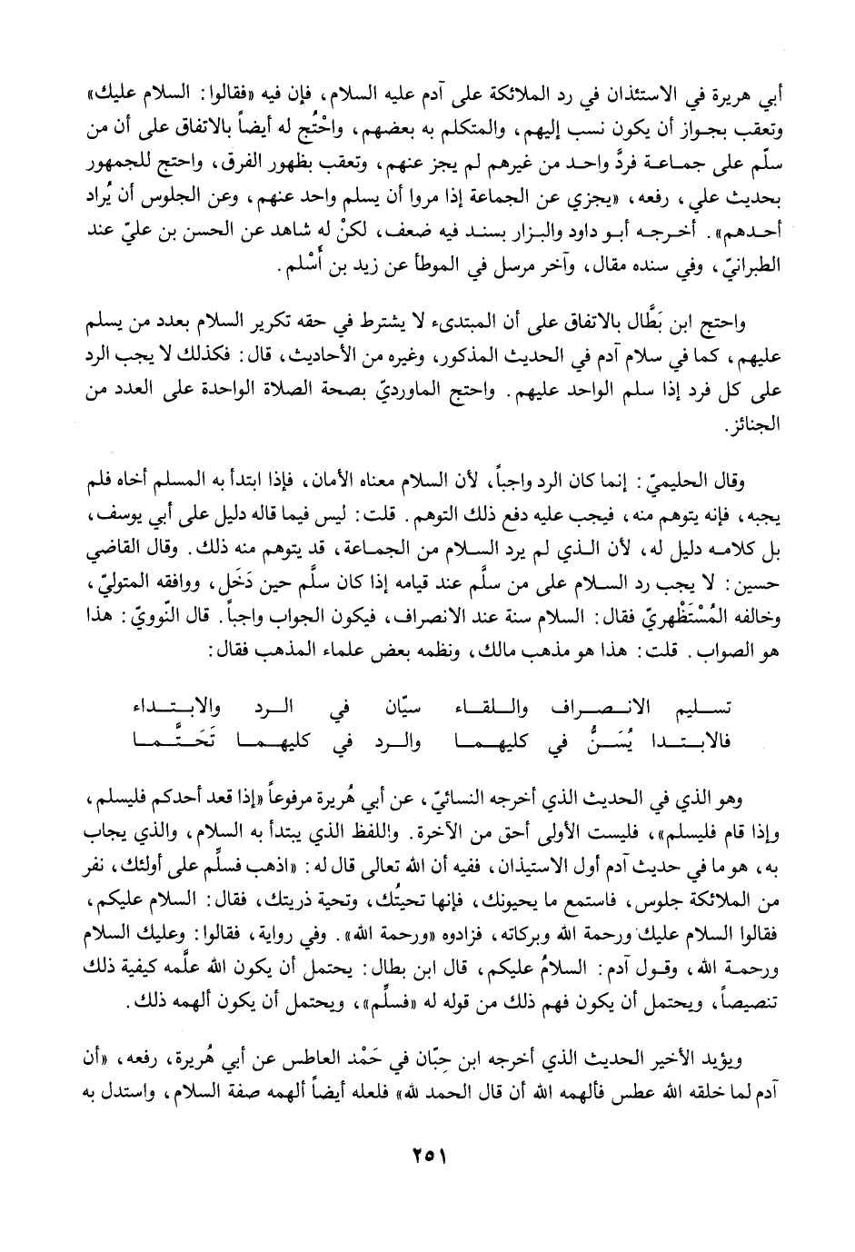 وهو الذي في الحديث الذي أخرجه النسائيّ، عن أبي هُريرة مرفوعًا "إذا قعد أحدكم فليسلم، وإذا قام فليسلم"، فليست الأولى أحق من الآخرة. وللفظ الذي يبتدأ به السلام، والذي يجاب به، هو ما في حديث آدم أول الاستيذان، ففيه أن الله تعالى قال له: "اذهب فسلِّم على أولئك، نفر من الملائكة جلوس، فاستمع ما يحيونك، فإنها تحيتُك، وتحية ذريتك، فقال: السلام عليكم، فقالوا السلام عليك ورحمة الله وبركاته، فزادوه "ورحمة الله". وفي رواية" فقالوا: وعليك السلام ورحمة الله، وقول آدم: السلامُ عليكم، قال ابن بطال: يحتمل أن يكون الله علَّمه كيفية ذلك تنصيصًا، ويحتمل أن يكون فهم ذلك من قوله له "فسلِّم"، ويحتمل أن يكون ألهمه ذلك.