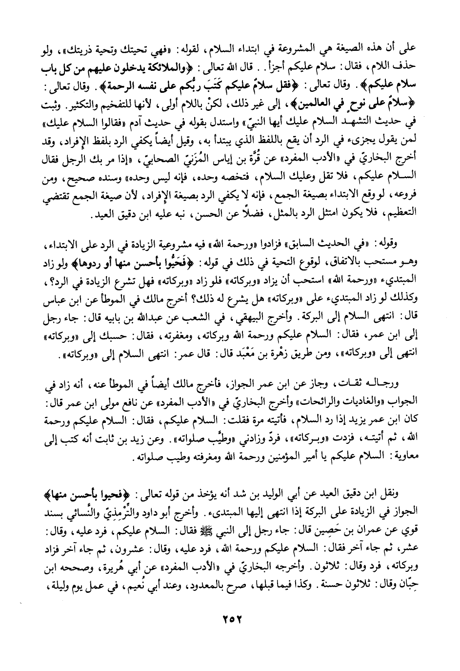 ونقل ابن دقيق العيد عن أبي الوليد بن شد أنه يؤخذ من قوله تعالى: {فَحَيُّوا بِأَحْسَنَ مِنْهَا} الجواز في الزيادة على البركة إذا انتهى إليها المبتدىء. وأخرج أبو داود والتِّرْمِذِيّ والنَّسائي بسند قوي عن عمران بن حَصِين قال: جاء رجل إلى النبي -صلى الله عليه وسلم- فقال: السلام عليكم، فرد عليه، وقال: عشر، ثم جاء آخر فقال: السلام عليكم ورحمة الله، فرد عليه، وقال: عشرون، ثم جاء آخر فزاد وبركاته، فرد وقال: ثلاثون. وأخرجه البخاريّ في "الأدب المفرد" عن أبي هُريرة، وصححه ابن حِبّان وقال: ثلاثون حسنة. وكذا فيما قبلها، صرح بالمعدود، وعند أبي نُعيم، في عمل يوم وليلة،