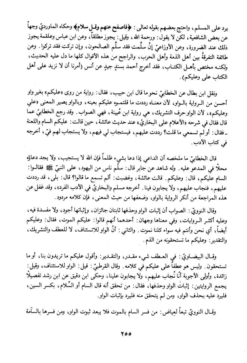 وقال النوويّ: الصواب أن إثبات الواو وحذفها ثابتان جائزان، وإثباتها أجود، ولا مفسدة فيه، وعليه أكثر الروايات، وفي معناها وجهان: أحدهما أنهم قالوا: عليكم الموت، فقال: وعليكم أيضًا، أي نحن وأنتم فيه سواء كلنا نموت. والثاني: أنّ الواو للاستئناف، لا للعطف والتشريك، والتقدير: وعليكم ما تستحقونه من الذم.