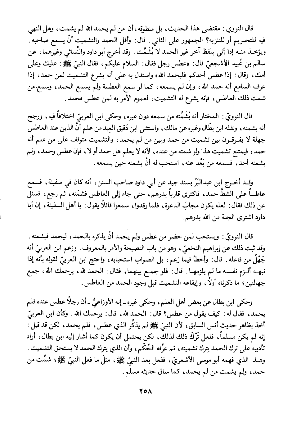 قال النووي: مقتضى هذا الحديث، بل منطوقه، أن من لم يحمد الله لم يشمت، وهل النهي فيه للتحريم أو للتنزيه؟ الجمهور على الثاني. قال: وأقل الحمد والتشميت أنْ يسمع صاحبه. ويؤخذ منه إذا أتى بلفظ آخر غير الحمد لا يُشَمَّت. وقد أخرج أبو داود والنَّسائي وغيرهما، عن سالم بن عُبيد الأشجعيّ قال: "عطس رجل فقال: السلام عليكم، فقال النبيّ -صلى الله عليه وسلم-: عليك وعلى أمك، وقال: إذا عطس أحدكم فليحمد الله" واستدل به على أنه يشرع التشميت لمن حمد، إذا عرف السامع أنه حمد الله، وإن لم يسمعه، كما لو سمع العطسة ولم يسمع الحمد، وسمع من شمت ذلك العاطس، فإنه يشرع له التشميت، لعموم الأمر به لمن عطس فحمد.