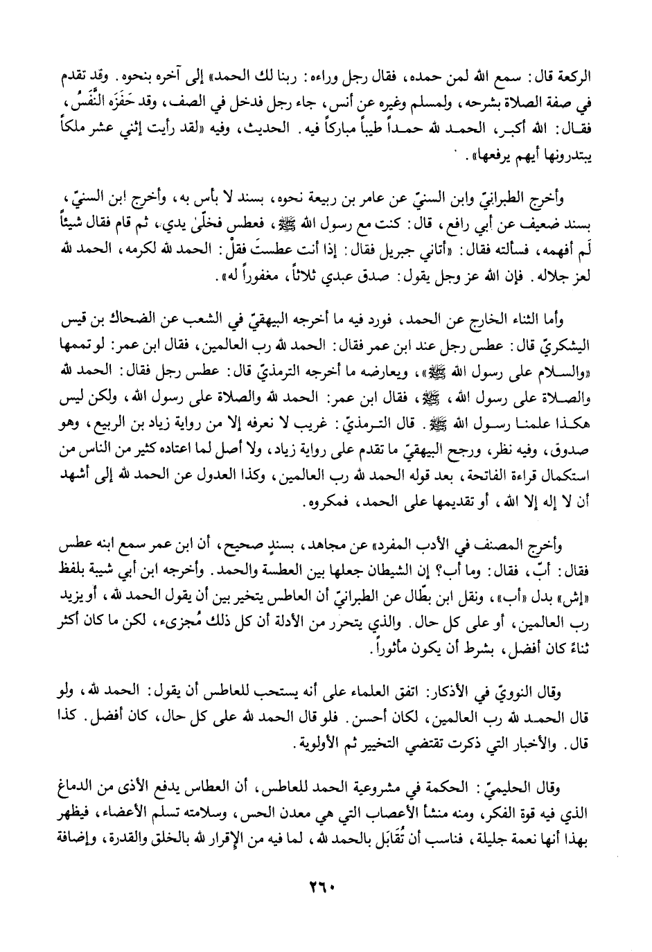 وأخرج الطبرانيّ وابن السنيّ عن عامر بن ربيعة نحوه، بسند لا بأس به، وأخرج ابن السنيّ، بسند ضعيف عن أبي رافع، قال: كنت مع رسول الله -صلى الله عليه وسلم-، فعطس فخلّى يدي.، ثم قام فقال شيئًا لَم أفهمه، فسألته فقال: "أتاني جبريل فقال: إذا أنت عطستَ فقلْ: الحمد لله لكرمه، الحمد لله لعز جلاله. فإن الله عَزَّ وَجَلَّ يقول: صدق عبدي ثلاثًا، مغفورًا له".