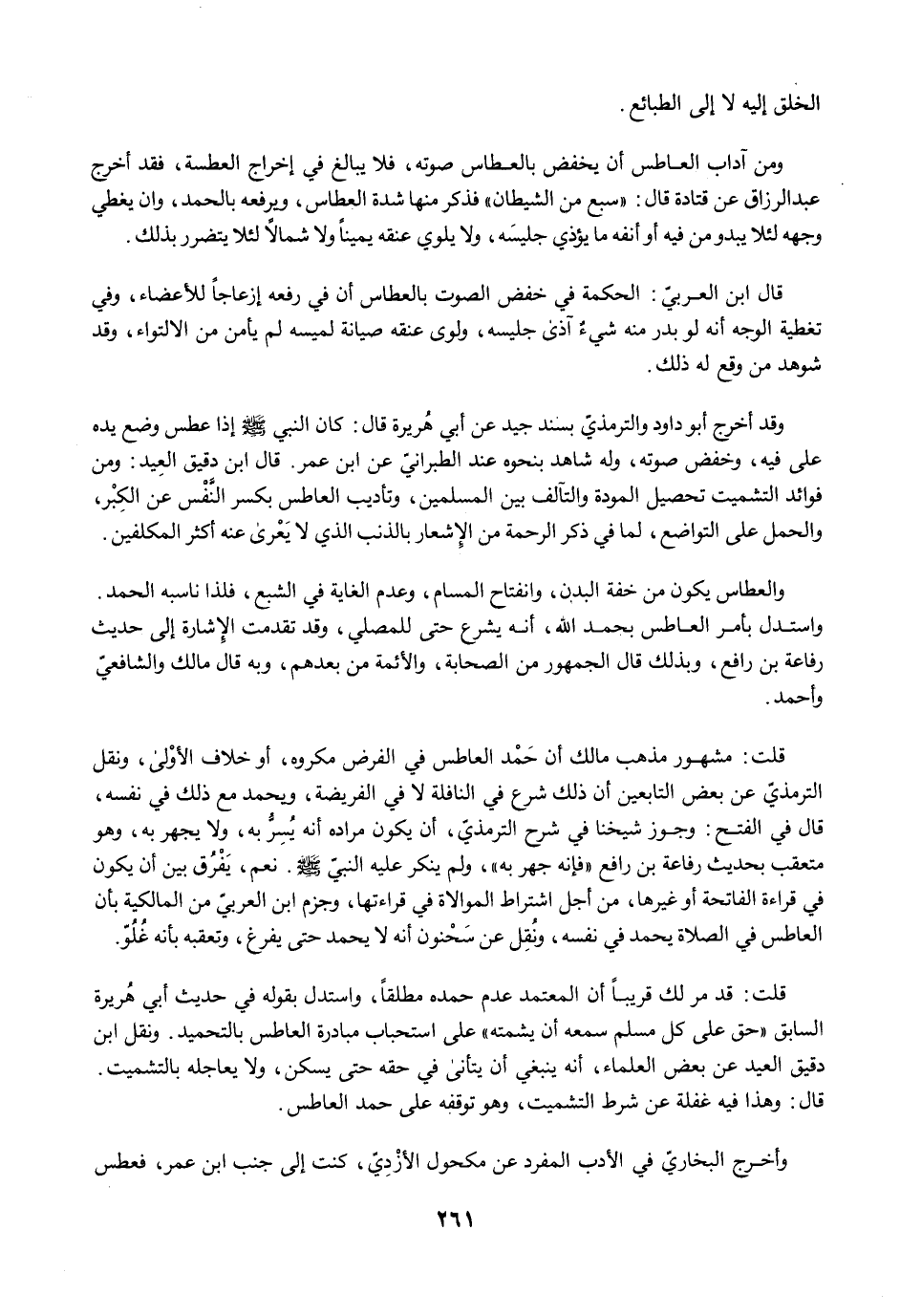 وقد أخرج أبو داود والترمذيّ بسند جيد عن أبي هُريرة قال: كان النبي -صلى الله عليه وسلم- إذا عطس وضع يده على فيه، وخفض صوته، وله شاهد بنحوه عند الطبرانيّ عن ابن عمر. قال ابن دقيق العِيد: ومن فوائد التشميت تحصيل المودة والتآلف بين المسلمين، وتأديب العاطس بكسر النَّفْس عن الكِبْر، والحمل على التواضع، لما في ذكر الرحمة من الإِشعار بالذنب الذي لا يَعْرى عنه أكثر المكلفين.