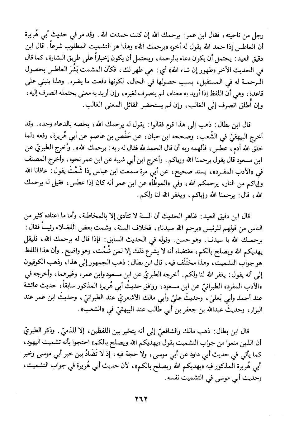 قال ابن دقيق العيد: ظاهر الحديث أن السنة لا تتأدى إلا بالمخاطبة، وأما ما اعتاده كثير من الناس من قولهم للرئيس "يرحم الله سيدنا"، فخلاف السنة، وشمت بعض الفضلاء رئيسًا فقال: يرحمك الله يا سيدنا. وهو حسن. وقوله في الحديث، السابق: فإذا قال له يرحمك الله، فليقل يهديكم الله ويصلح بالكم، مقتضاه أنه لا يشرع ذلك إلا لمن شُمِّت، وهو واضح. وأن هذا اللفظ هو جواب التشميت، وهذا مختَلَف فيه، قال ابن بطال: ذهب الجمهور إلى هذا، وذهب الكوفيون إلى أنه يقول: يغفر الله لنا ولكم. أخرجه الطبريّ عن ابن مسعود وابن عمر، وغيرهما، وأخرجه في "الأدب المفرد" الطبرانيّ عن ابن مسعود، ووافق حديثُ أبي هُريرة المذكور سابقًا، حديث عائشة عند أحمد وأبي يَعلى، وحديثَ عليّ وأبي مالك الأشعريّ عند الطبرانيّ، وحديثَ ابن عمر عند البزار، وحديثَ عبد الله بن جعفر بن أبي طالب عند البيهقي في "الشعب".