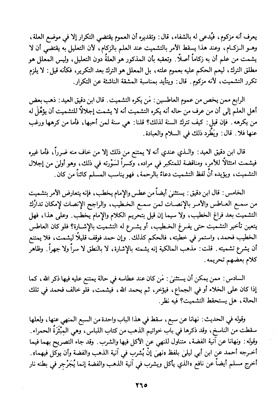 الخامس: قال ابن دقيق: يستثنى أيضًا من عطس والإمام يخطب، فإنه يتعارض الأمر بتشميت من سمع العاطس والأمر بالإنصات لمن سمع الخطيب، والراجح الإنصاف لإمكان تدارُك التشميت بعد فراغ الخطيب، ولاسيما إن قيل بتحريم الكلام والإمام يخطب. وعلى هذا، فهل يتعين تأخير التشميت حتى يفرغ الخطيب، أو يشرع له التشميت بالإشارة؟ فلو كان العاطس الخطيب فحمد، واستمر في خطبته، فالحكم كذلك. وإن حمد فوقف قليلًا ليشمت، فلا يمتنع أن يشرع تشميته. قلت: مذهب المالكية إنه يشمته بالإشارة، لا بالنطق لا سرًا ولا جهرًا. وظاهر كلام بعضهم تحريمه.