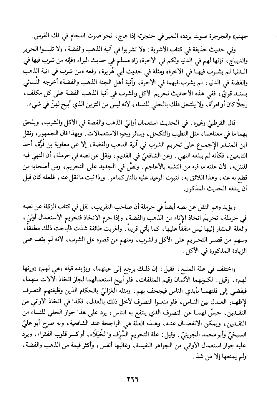 ويؤيد وهم النقل عن نصه أيضًا في حرملة أن صاحب التقريب، نقل في كتاب الزكاة عن نصه في حرملة، تحريم اتخاذ الإناء من الذهب والفضة، وإذا حرم الاتخاذ فتحريم الاستعمال أولى، والعلة المشار إليها ليس متفقًا عليها، كما يأتي قريبًا. وأغربت طائفة شذت فأباحت ذلك مطلقًا، ومنهم من قصر التحريم على الأكل والشرب، ومنهم من قصره عل الشرب؛ لأنه لم يقف على الزيادة المذكورة في الأكل.