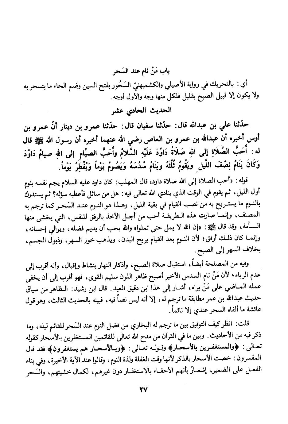 قلت: انظر كيف التوفيق بين ما ترجم له البخاري من فضل النوم عند السَحر للقائم ليله، وما ذكر فيه من الأحاديث. وبين ما في القرآن من مدح الله تعالى للقائمين المستغفرين بالأسحار كقوله تعالى: {وَالْمُسْتَغْفِرِينَ بِالْأَسْحَارِ} وقوله تعالى: {وَبِالْأَسْحَارِ هُمْ يَسْتَغْفِرُونَ} فقد قال المفسرون: خصت الأسحار بالذكر لأنها وقت الغفلة ولذة النوم، وقالوا عند الآية الأخيرة، وفي بناء الفعل على الضمير، إشعارٌ بأنهم الأحقاء بالاستغفار دون غيرهم، لكمال خشيتهم، والسَحر