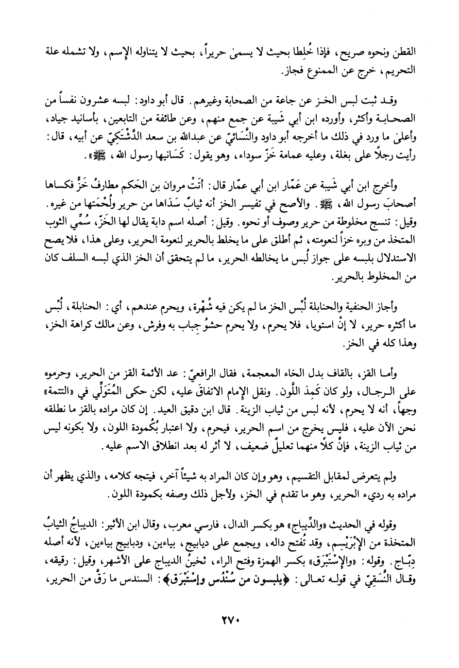 وأخرج ابن أبي شَيبة عن عَمّار ابن أبي عمّار قال: أتَتْ مروان بن الحَكم مطارفُ خَزٍّ فكساها أصحابَ رسول الله -صلى الله عليه وسلم-. والأصح في تفيسر الخز أنه ثياث سَدَاها من حرير ولُحْمَتها من غيره. وقيل: تنسج مخلوطة من حرير وصوف أو نحوه. وقيل: أصله اسم دابة يقال لها الخَزّ، سُمِّي الثوب المتخذ من وبره خزًا لنعومته، ثم أطلق على ما يخلط بالحرير لنعومة الحرير، وعلى هذا، فلا يصح الاستدلال بلبسه على جواز لُبس ما يخالطه الحرير، ما لم يتحقق أن الخز الذي لبسه السلف كان من المخلوط بالحرير.