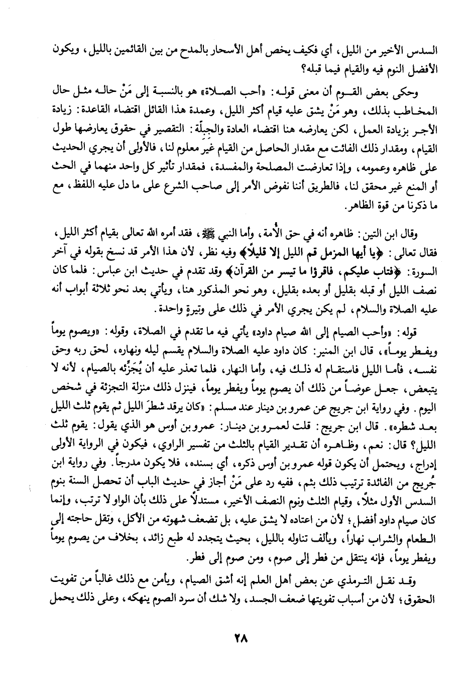 وحكى بعض القوم أن معنى قوله: "أحب الصلاة" هو بالنسبة إلى مَنْ حاله مثل حال المخاطب بذلك، وهو مَنْ يشق عليه قيام أكثر الليل، وعمدة هذا القائل اقتضاء القاعدة: زيادة الأجر بزيادة العمل، لكن يعارضه هنا اقتضاء العادة والجِبِلّة: التقصير في حقوق يعارضها طول القيام، ومقدار ذلك الفائت مع مقدار الحاصل من القيام غير معلوم لنا، فالأولى أن يجري الحديث على ظاهره وعمومه، وإذا تعارضت المصلحة والمفسدة، فمقدار تأثير كل واحد منهما في الحث أو المنع غير محقق لنا، فالطريق أننا نفوض الأمر إلى صاحب الشرع على ما دل عليه اللفظ، مع ما ذكرنا من قوة الظاهر.