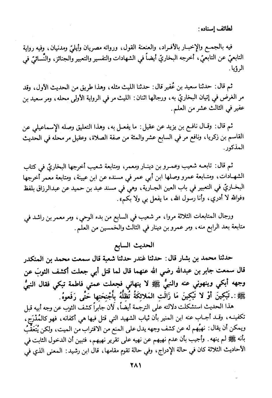 حَدَّثَنَا مُحَمَّدُ بْنُ بَشَّارٍ قَالَ: حَدَّثَنَا غُنْدَرٌ حَدَّثَنَا شُعْبَةُ قَالَ سَمِعْتُ مُحَمَّدَ بْنَ الْمُنْكَدِرِ قَالَ سَمِعْتُ جَابِرَ بْنَ عَبْدِ اللَّهِ رضي الله عنهما قَالَ لَمَّا قُتِلَ أَبِي جَعَلْتُ أَكْشِفُ الثَّوْبَ عَنْ وَجْهِهِ أَبْكِي، وَيَنْهَوْنِي عَنْهُ وَالنَّبِىُّ -صلى الله عليه وسلم- لاَ يَنْهَانِي، فَجَعَلَتْ عَمَّتِي فَاطِمَةُ تَبْكِي، فَقَالَ النَّبِيُّ -صلى الله عليه وسلم-: تَبْكِينَ أَوْ لاَ تَبْكِينَ، مَا زَالَتِ الْمَلاَئِكَةُ تُظِلُّهُ بِأَجْنِحَتِهَا حَتَّى رَفَعُوهُ.