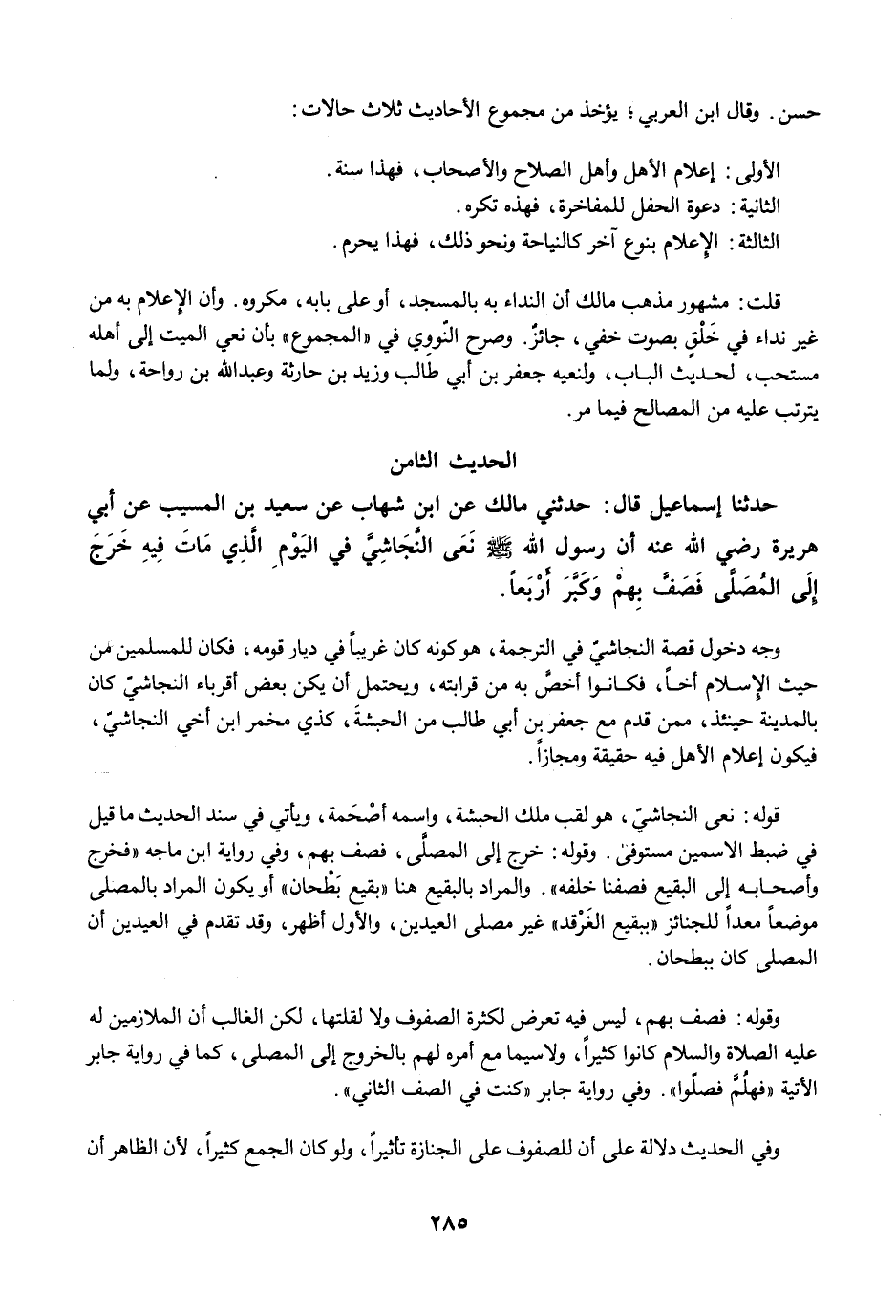 قلت: مشهور مذهب مالك أن النداء به بالمسجد، أو على بابه، مكروه. وأن الإِعلام به من غير نداء في خَلْقٍ بصوت خفي، جائز. وصرح النّووِي في "المجموع" بأن نعي الميت إلى أهله مستحب، لحديث الباب، ولنعيه جعفر بن أبي طالب وزيد بن حارثة وعبد الله بن رواحة، ولما يترتب عليه من المصالح فيما مرَّ.