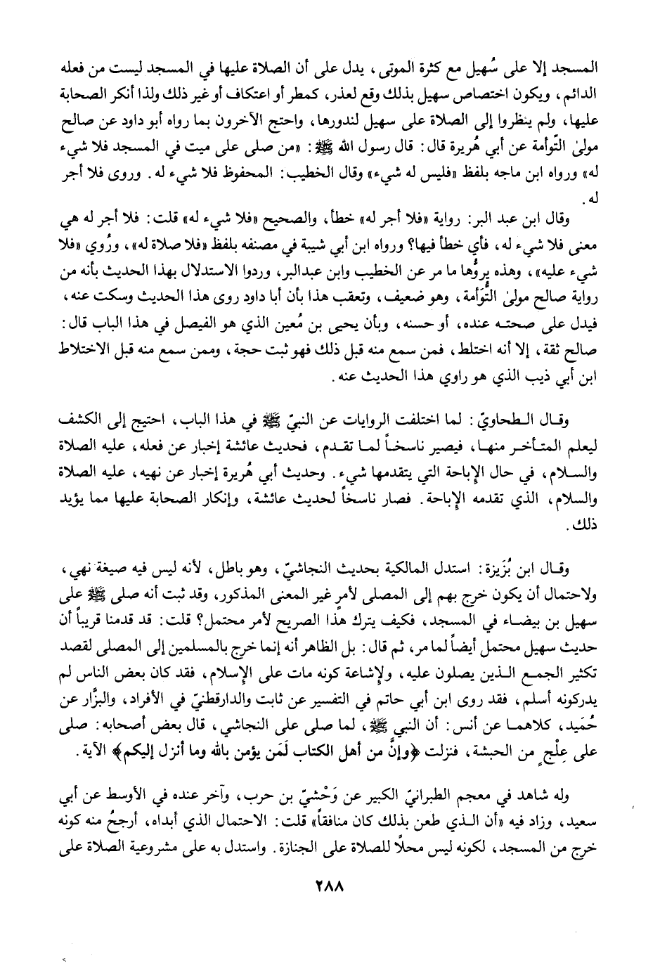 المسجد إلا على سُهيل مع كثرة الموتى، يدل على أن الصلاة عليها في المسجد ليست من فعله الدائم، ويكون اختصاص سهيل بذلك وقع لعذر، كمطر أو اعتكاف أو غير ذلك ولذا أنكر الصحابة عليها، ولم ينظروا إلى الصلاة على سهيل لندورها، واحتج الآخرون بما رواه أبو داود عن صالح مولى التوأمة عن أبي هُريرة قال: قال رسول الله -صلى الله عليه وسلم-: "من صلى على ميت في المسجد فلا شيء له" ورواه ابن ماجه بلفظ "فليس له شيء" وقال الخطيب: المحفوظ فلا شيء له. وروى فلا أجر له.