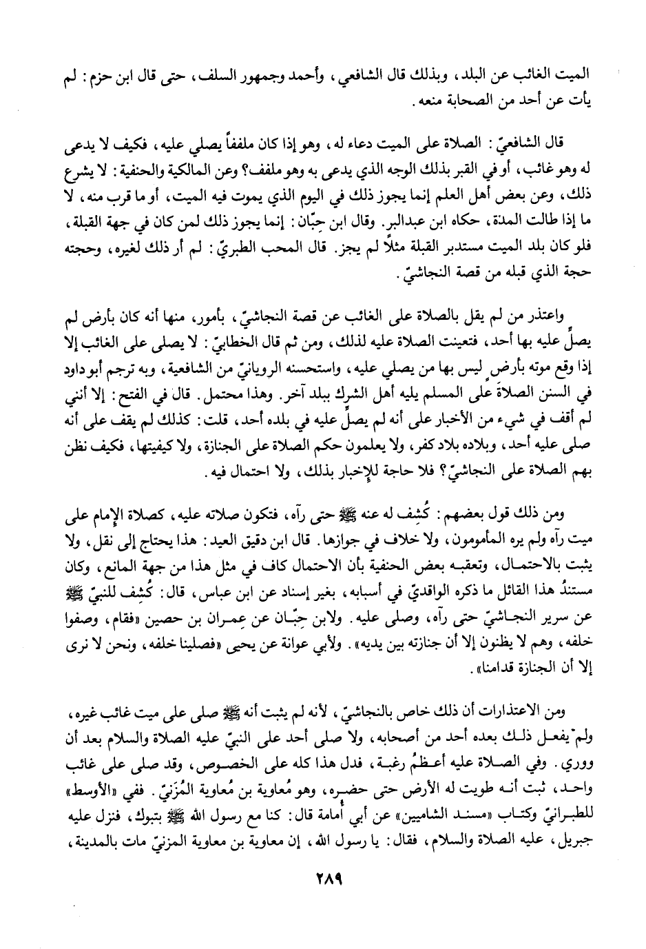 قال الشافعيّ: الصلاة على الميت دعاء له، وهو إذا كان ملففًا يصلي عليه، فكيف لا يدعى له وهو غائب، أو في القبر بذلك الوجه الذي يدعى به وهو ملفف؟ وعن المالكية والحنفية: لا يشرع ذلك، وعن بعض أهل العلم إنما يجوز ذلك في اليوم الذي يموت فيه الميت، أو ما قرب منه، لا ما إذا طالت المدة، حكاه ابن عبد البر. وقال ابن حِبّان: إنما يجوز ذلك لمن كان في جهة القبلة، فلو كان بلد الميت مستدبر القبلة مثلًا لم يجز. قال المحب الطبريّ: لم أر ذلك لغيره، وحجته حجة الذي قبله من قصة النجاشيّ.