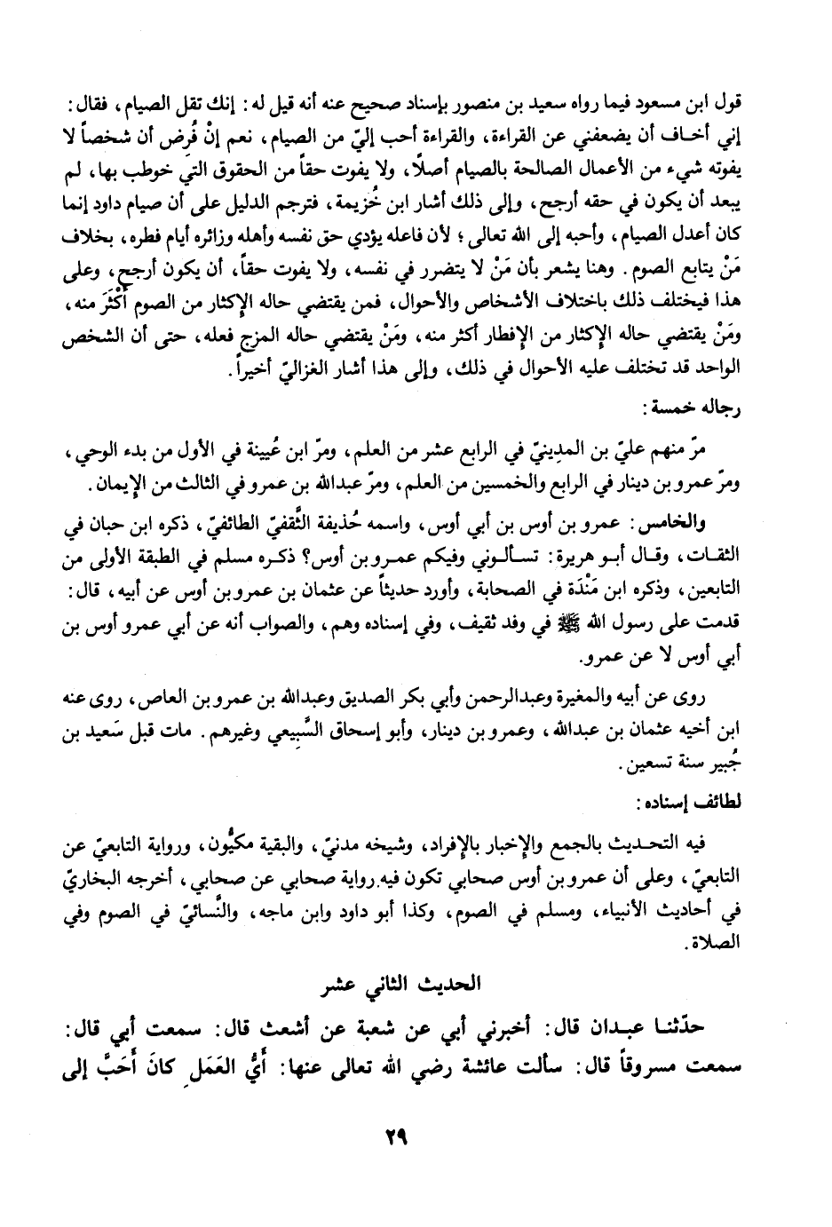 قول ابن مسعود فيما رواه سعيد بن منصور بإسناد صحيح عنه أنه قيل له: إنك تقل الصيام، فقال: إني أخاف أن يضعفني عن القراءة، والقراءة أحب إليّ من الصيام، نعم إنْ فُرِض أن شخصًا لا يفوته شيء من الأعمال الصالحة بالصيام أصلًا، ولا يفوت حقًا من الحقوق التي خوطب بها، لم يبعد أن يكون في حقه أرجح، وإلى ذلك أشار ابن خُزيمة، فترجم الدليل على أن صيام داود إنما كان أعدل الصيام، وأحبه إلى الله تعالى؛ لأن فاعله يؤدي حق نفسه وأهله وزائره أيام فطره، بخلاف مَنْ يتابع الصوم. وهنا يشعر بأن مَنْ لا يتضرر في نفسه، ولا يفوت حقًا، أن يكون أرجح، وعلى هذا فيختلف ذلك باختلاف الأشخاص والأحوال، فمن يقتضي حاله الإكثار من الصوم أكْثَرَ منه، ومَنْ يقتضي حاله الإكثار من الإفطار أكثر منه، ومَنْ يقتضي حاله المزج فعله، حتى أن الشخص الواحد قد تختلف عليه الأحوال في ذلك، وإلى هذا أشار الغزاليّ أخيرًا.