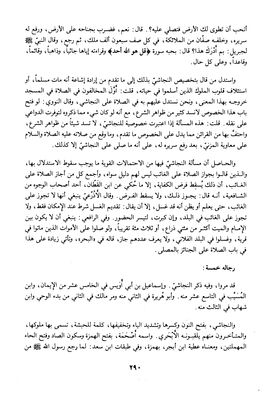 أتحب أن تطوى لك الأرض فتصلي عليه؟. قال: نعم، فضرب بجناحه على الأرض، ورفع له سريره، وخلفه صفّان من الملائكة، في كل صف سبعون ألف ملك، ثم رجع، وقال النبيّ -صلى الله عليه وسلم- لجبريل: بم أدْرَكَ هذا؟ قال: بحبه سورة {قُلْ هُوَ اللَّهُ أَحَدٌ} وقراءته إياها جاثيًا، وذاهبًا، وقائمًا، وقاعدًا، وعلى كل حال.