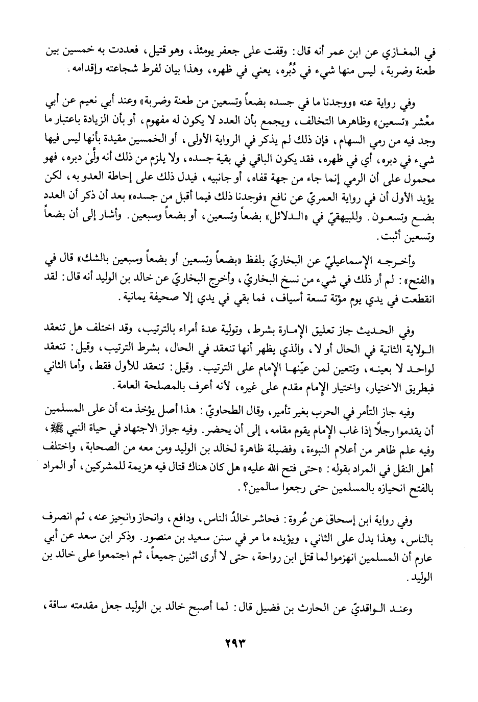 وفي رواية عنه "ووجدنا ما في جسده بضعًا وتسعين من طعنة وضربة" وعند أبي نعيم عن أبي معشر "تسعين" وظاهرها التخالف، ويجمع بأن العدد لا يكون له مفهوم، أو بأن الزيادة باعتبار ما وجد فيه من رمي السهام، فإن ذلك لم يذكر في الرواية الأولى، أو الخمسين مقيدة بأنها ليس فيها شيء في دبره، أي في ظهره، فقد يكون الباقي في بقية جسده، ولا يلزم من ذلك أنه ولَّى دبره، فهو محمول على أن الرمي إنما جاء من جهة قفاه، أو جانبيه، فيدل ذلك على إحاطة العدو به، لكن يؤيد الأول أن في رواية العمريّ عن نافع "فوجدنا ذلك فيما أقبل من جسده" بعد أن ذكر أن العدد بضع وتسعون. وللبيهقيّ في "الدلائل" بضعًا وتسعين، أو بضعًا وسبعين. وأشار إلى أن بضعًا وتسعين أثبت.