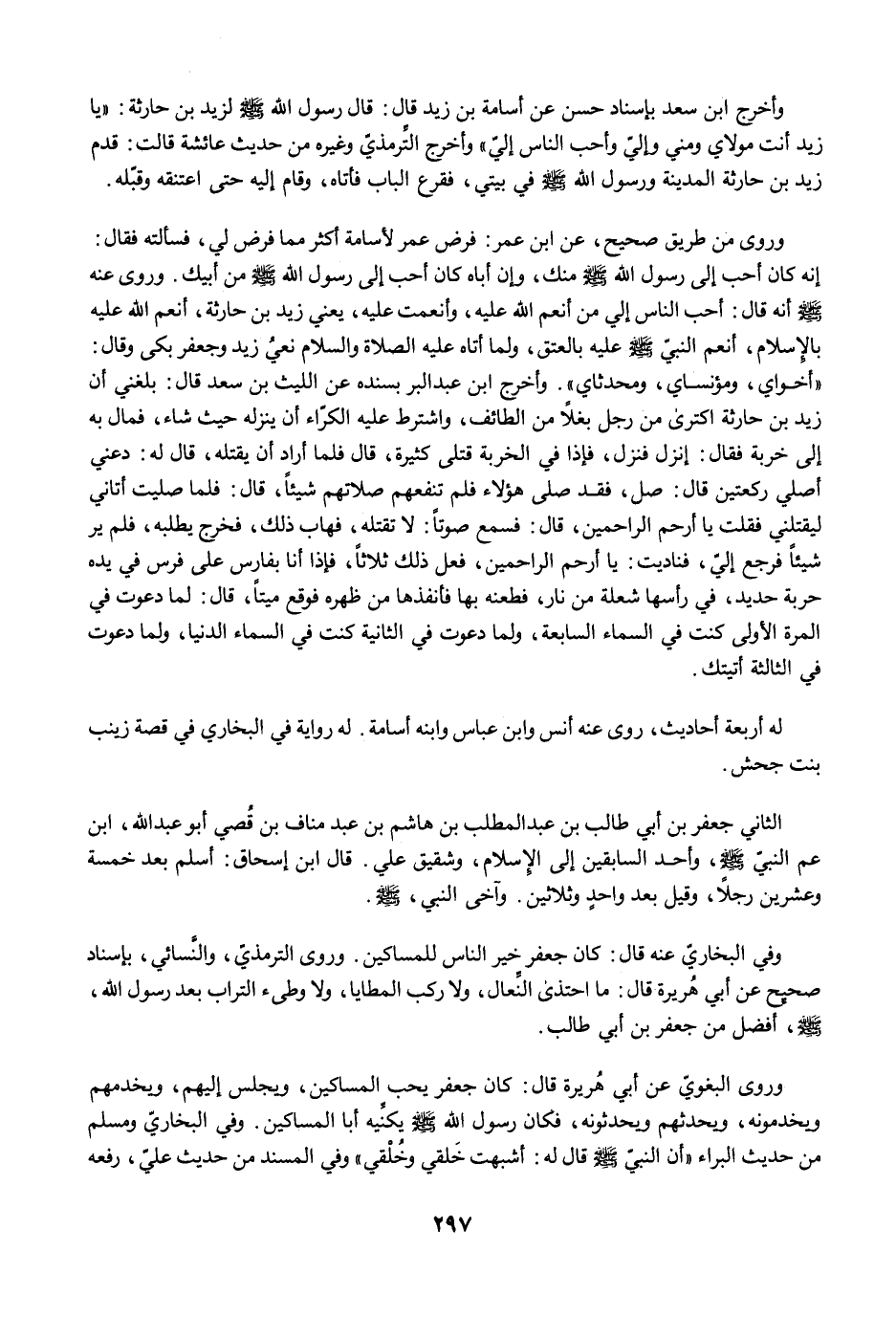 وأخرج ابن سعد بإسناد حسن عن أسامة بن زيد قال: قال رسول الله -صلى الله عليه وسلم- لزيد بن حارثة: "يا زيد أنت مولاي ومني وإليّ وأحب الناس إليّ" وأخرج التِّرمذيّ وغيره من حديث عائشة قالت: قدم زيد بن حارثة المدينة ورسول الله -صلى الله عليه وسلم- في بيتي، فقرع الباب فأتاه، وقام إليه حتى اعتنقه وقبّله.