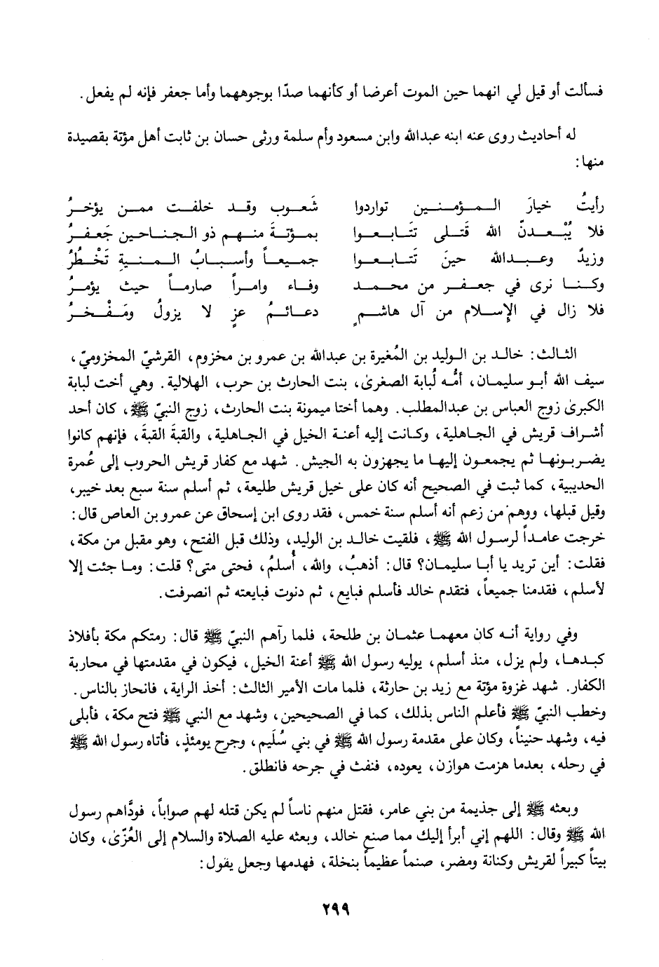 الثالث: خالد بن الوليد بن المُغيرة بن عبد الله بن عمرو بن مخزوم، القرشيّ المخزوميّ، سيف الله أبو سليمان، أمُّه لُبابة الصغرى، بنت الحارث بن حرب، الهلالية. وهي أخت لبابة الكبرى زوج العباس بن عبد المطلب. وهما أختا ميمونة بنت الحارث، زوج النبيّ -صلى الله عليه وسلم-، كان أحد أشراف قريش في الجاهلية، وكانت إليه أعنة الخيل في الجاهلية، والقبةَ القبةَ، فإنهم كانوا يضربونها ثم يجمعون إليها ما يجهزون به الجيش. شهد مع كفار قريش الحروب إلى عُمرة الحديبية، كما ثبت في الصحيح أنه كان على خيل قريش طليعة، ثم أسلم سنة سبع بعد خيبر، وقيل قبلها، ووهم من زعم أنه أسلم سنة خمس، فقد روى ابن إسحاق عن عمرو بن العاص قال: خرجت عامدًا لرسول الله -صلى الله عليه وسلم-، فلقيت خالد بن الوليد، وذلك قبل الفتح، وهو مقبل من مكة، فقلت: أين تريد يا أبا سليمان؟ قال: أذهبُ، والله، أُسلمُ، فحتى متى؟ قلت: وما جئت إلا لأسلم، فقدمنا جميعًا، فتقدم خالد فأسلم فبايع، ثم دنوت فبايعته ثم انصرفت.