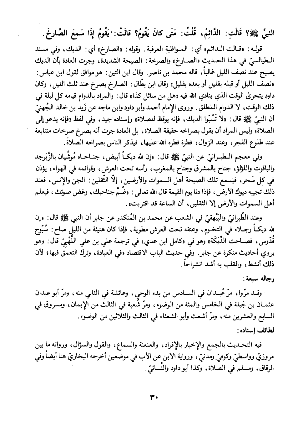 وعند الطّبرانيّ والبَيْهقيّ في الشعب عن محمد بن المُنكدر عن جابر أن النبي -صلى الله عليه وسلم- قال: "إن لله ديكًا رجلاه في التخوم، وعنقه تحت العرش مطوية، فإذا كان هنيئة من الليل صاح: سُبّوح قُدّوس، فصاحت الدَّيَكَة" وهو في "كامل ابن عدي" في ترجمة علي بن علي اللُّهْبيّ قال: وهو يروي أحاديث منكرة عن جابر. وفي حديث الباب الاقتصاد "في العبادة، وترك التعمق فيها؛ لأن ذلك أنشط، والقلب به أشد انشراحًا.