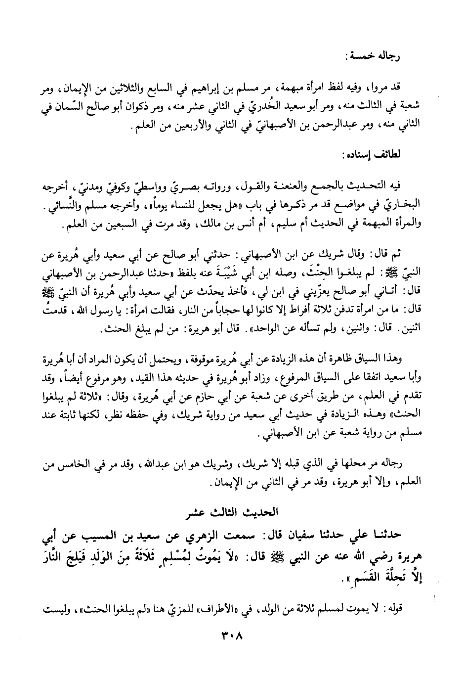 ثم قال: وقال شريك عن ابن الأصبهاني: حدثني أبو صالح عن أبي سعيد وأبي هُريرة عن النبيّ -صلى الله عليه وسلم-: لم يبلغوا الحِنْثَ، وصله ابن أبي شَيْبَةَ عنه بلفظ "حدثنا عبد الرحمن بن الأصبهاني قال: أتاني أبو صالح يعزّيني في ابن لي، فأخذ يحدّث عن أبي سعيد وأبي هُريرة أن النبيّ -صلى الله عليه وسلم- قال: ما من امرأة تدفن ثلاثة أفراط إلا كانوا لها حجابًا من النار، فقالت امرأة: يا رسول الله، قدمتُ اثنين. قال: واثنين، ولم تسأله عن الواحد". قال أبو هريرة: من لم يبلغ الحنث.
