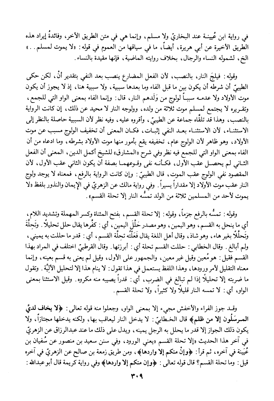 وقد جوز الفراء والأخفش مجيء إلا بمعنى الواو، وجعلوا منه قوله تعالى: {لَا يَخَافُ لَدَيَّ الْمُرْسَلُونَ (10) إِلَّا مَنْ ظَلَمَ} قال الخطابيّ: لا يدخل النار ليعاقب بها، ولكنه يدخلها مجتازًا، ولا يكون ذلك الجواز إلا قدر ما يحلل به الرجل يمينه، ويدل على ذلك ما عند عبد الرزاق عن الزهريّ في آخر هذا الحديث "إلا تحلة القسم" يعني الورود، وفي سنن سعيد بن منصور عن سُفيان بن عُيَينة في آخره، ثم قرأ: {وَإِنْ مِنْكُمْ إِلَّا وَارِدُهَا}، ومن طريق زمعة بن صالح عن الزهريّ في آخره قيل: وما تحلة القسم؟ قال قوله تعالى: {وَإِنْ مِنْكُمْ إِلَّا وَارِدُهَا} وفي رواية كريمة قال أبو عبد الله: