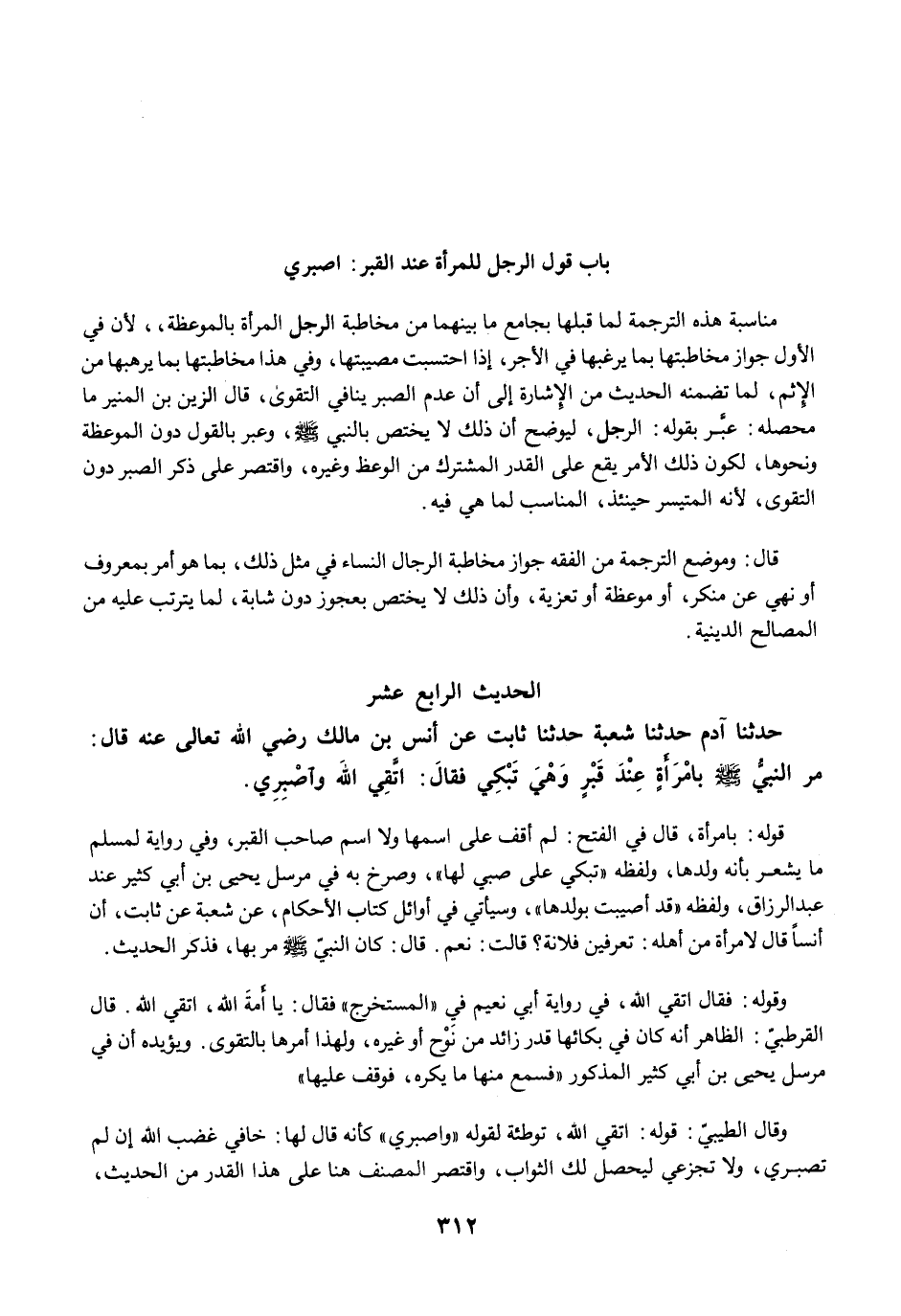 حَدَّثَنَا آدَمُ حَدَّثَنَا شُعْبَةُ حَدَّثَنَا ثَابِتٌ عَنْ أَنَسِ بْنِ مَالِكٍ رضي الله عنه قَالَ: مَرَّ النَّبِيُّ -صلى الله عليه وسلم- بِامْرَأَةٍ عِنْدَ قَبْرٍ وَهِىَ تَبْكِي فَقَالَ: اتَّقِي اللَّهَ وَاصْبِرِي.