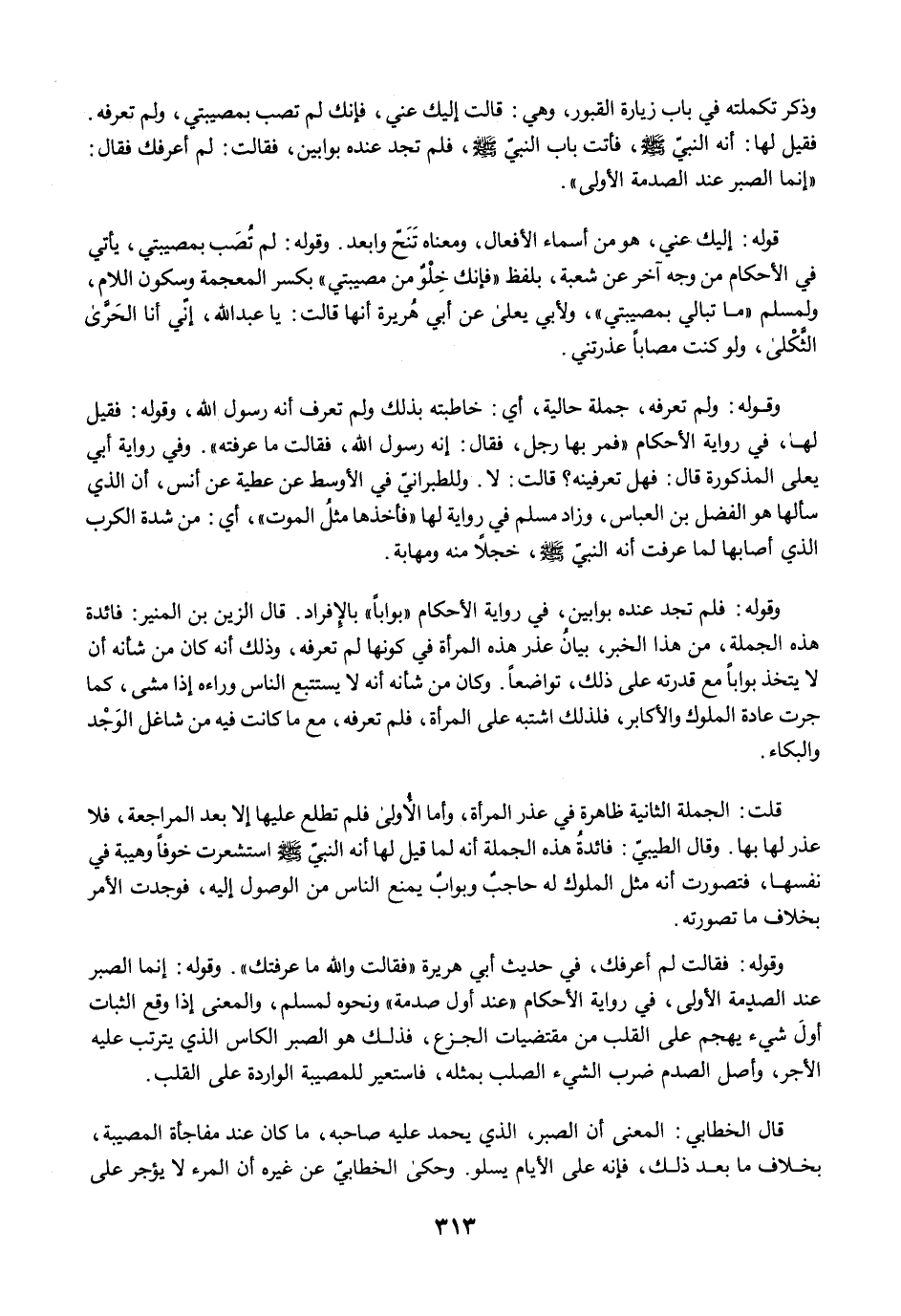 وذكر تكملته في باب زيارة القبور، وهي: قالت إليك عني، فإنك لم تصب بمصيبتي، ولم تعرفه. فقيل لها: أنه النبيّ -صلى الله عليه وسلم-، فأتت باب النبيّ -صلى الله عليه وسلم-، فلم تجد عنده بوابين، فقالت: لم أعرفك فقال: "إنما الصبر عند الصدمة الأولى".