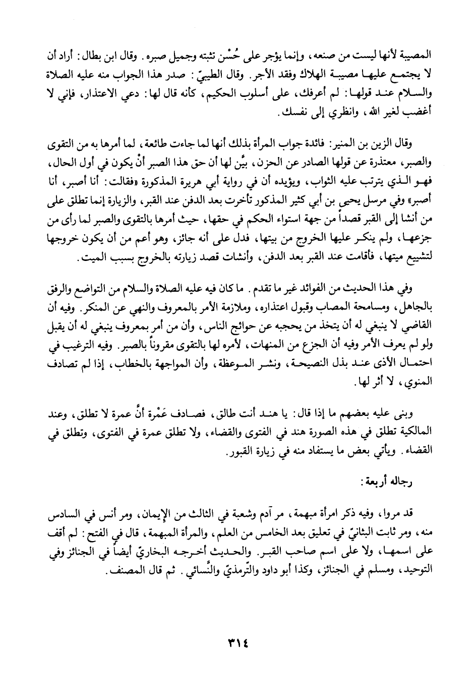 وقال الزين بن المنير: فائدة جواب المرأة بذلك أنها لما جاءت طائعة، لما أمرها به من التقوى والصبر، معتذرة عن قولها الصادر عن الحزن، بيَّن لها أن حق هذا الصبر أنْ يكون في أول الحال، فهو الذي يترتب عليه الثواب، ويؤيده أن في رواية أبي هريرة المذكورة "فقالت: أنا أصبر، أنا أصبر" وفي مرسل يحيى بن أبي كثير المذكور تأخرت بعد الدفن عند القبر، والزيارة إنما تطلق على من أنشا إلى القبر قصدًا من جهة استواء الحكم في حقها، حيث أمرها بالتقوى والصبر لما رأى من جزعها، ولم ينكر عليها الخروج من بيتها، فدل على أنه جائز، وهو أعم من أن يكون خروجها لتشييع ميتها، فأقامت عند القبر بعد الدفن، وأنشات قصد زيارته بالخروج بسبب الميت.