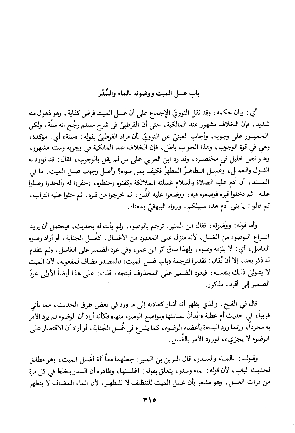 أي: بيان حكمه، وقد نقل النوويّ الإِجماع على أن غسل الميت فرض كفاية، وهو ذهول منه شديد، فإن الخلاف مشهور عند المالكية، حتى أن القرطبيّ في شرح مسلم رجَّح أنه سنّة، ولكن الجمهور على وجوبه، وأجاب العينيّ عن النوويّ بأن مراد القرطبيّ بقوله: "سنة" أي: مؤكدة، وهي في قوة الوجوب، وهذا الجواب باطل، فإن الخلاف عند المالكية في وجوبه وسنته مشهور، وهو نص خليل في مختصره، وقد رد ابن العربي على من لم يقل بالوجوب، فقال: قد توارد به القول والعمل، وغُسِل الطاهرُ المطهرُ فكيف بمن سواه؟ وأصل وجوب غسل الميت، ما في المسند، أن آدم عليه الصلاة والسلام غسلته الملائكة وكفنوه وحنطوه، وحفروا له وألحدوا وصلوا عليه. ثم دخلوا قبره فوضعوه فيه، ووضعوا عليه اللِّبن، ثم خرجوا من قبره، ثم حثوا عليه التراب، ثم قالوا: يا بني آدم هذه سبيلكم، ورواه البيهقيّ بمعناه.