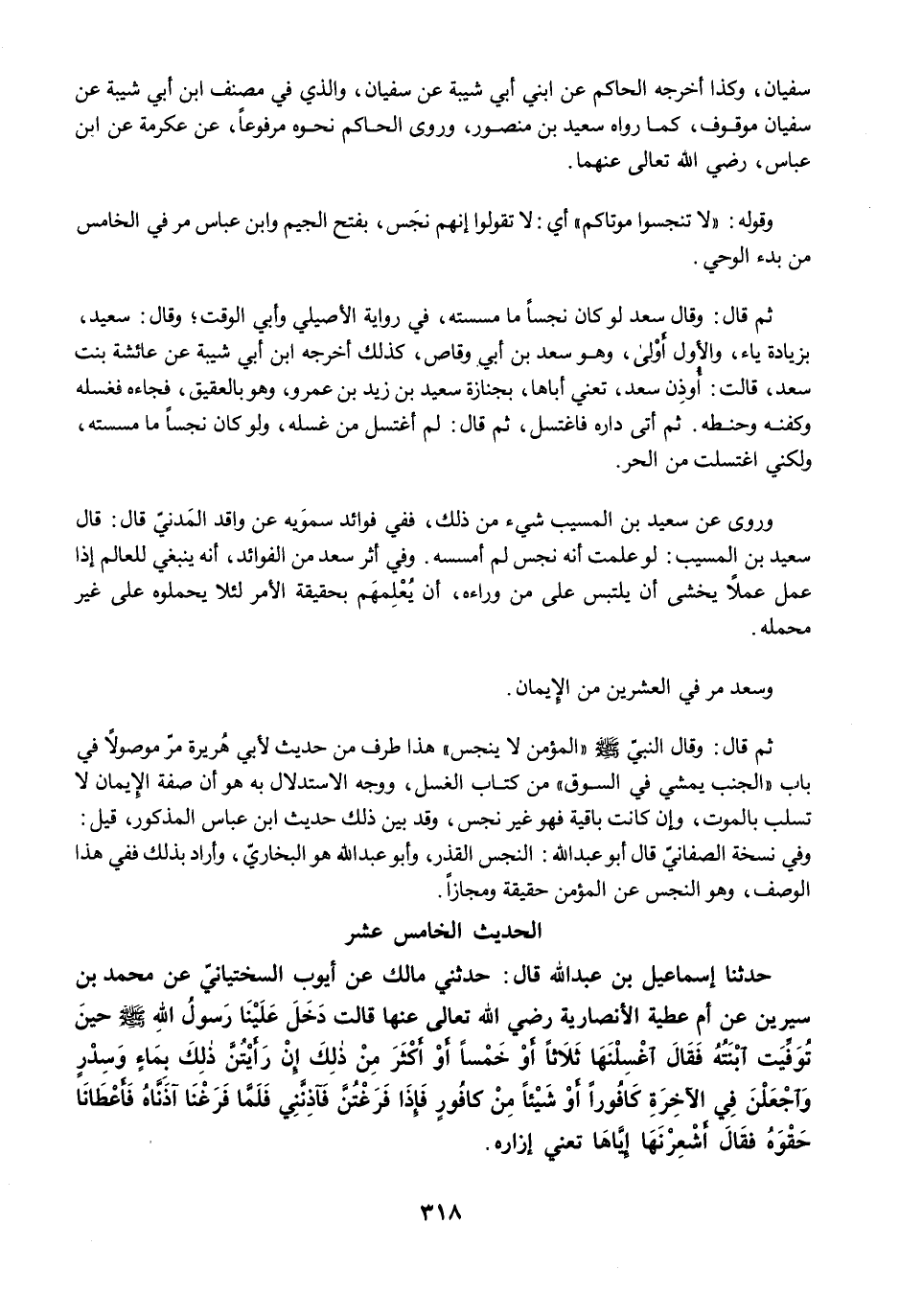 ثم قال: وقال سعد لو كان نجسًا ما مسسته، في رواية الأصيلي وأبي الوقت؛ وقال: سعيد، بزيادة ياء، والأول أَوْلى، وهو سعد بن أبي وقاص، كذلك أخرجه ابن أبي شيبة عن عائشة بنت سعد، قالت: أُوذِن سعد، تعني أباها، بجنازة سعيد بن زيد بن عمرو، وهو بالعقيق، فجاءه فغسله وكفنه وحنطه. ثم أتى داره فاغتسل، ثم قال: لم أغتسل من غسله، ولو كان نجسًا ما مسسته، ولكني اغتسلت من الحر.