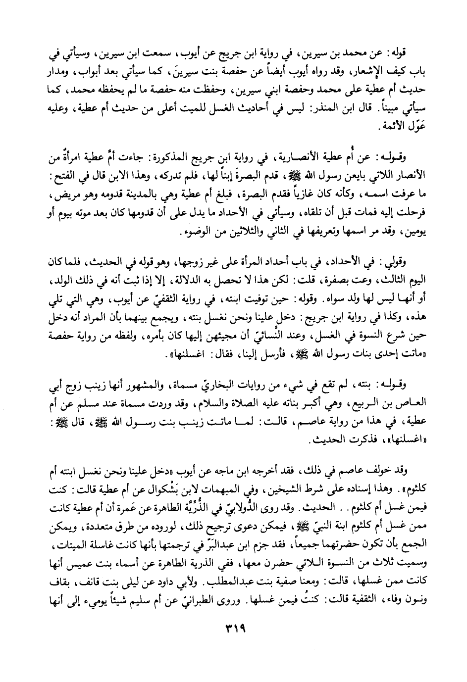 وقوله: عن أُم عطية الأنصارية، في رواية ابن جريج المذكورة: جاءت أمَّ عطية امرأةٌ من الأنصار اللاتي بايعن رسول الله -صلى الله عليه وسلم-، قدم البصرةَ إبنًا لها، فلم تدركه، وهذا الابن قال في الفتح: ما عرفت اسمه، وكأنه كان غازيًا فقدم البصرة، فبلغ أم عطية وهي بالمدينة قدومه وهو مريض، فرحلت إليه فمات قبل أن تلقاه، وسيأتي في الأحداد ما يدل على أن قدومها كان بعد موته بيوم أو يومين، وقد مرَّ اسمها وتعريفها في الثاني والثلاثين من الوضوء.